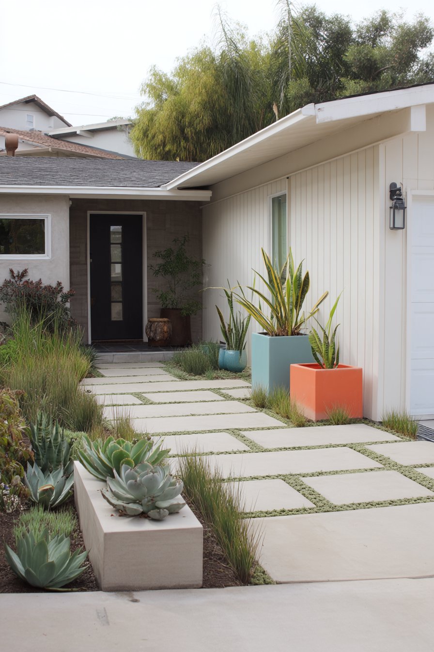 The sleek concrete pathway interspersed with lush greenery creates a modern aesthetic, complemented by vibrant planters housing striking succulents like agave and echeveria. To replicate this look, consider using geometric paving stones and incorporating drought-resistant plants for low-maintenance beauty.