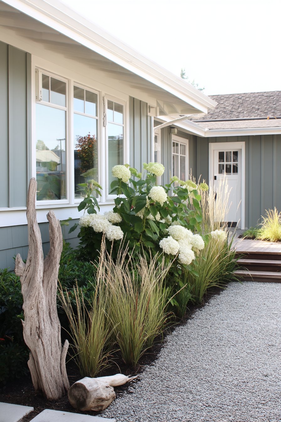 The elegant white hydrangeas create a stunning focal point, beautifully complemented by wispy ornamental grasses that add texture and movement. To replicate this look, choose low-maintenance plants and incorporate gravel pathways for a modern, clean aesthetic.