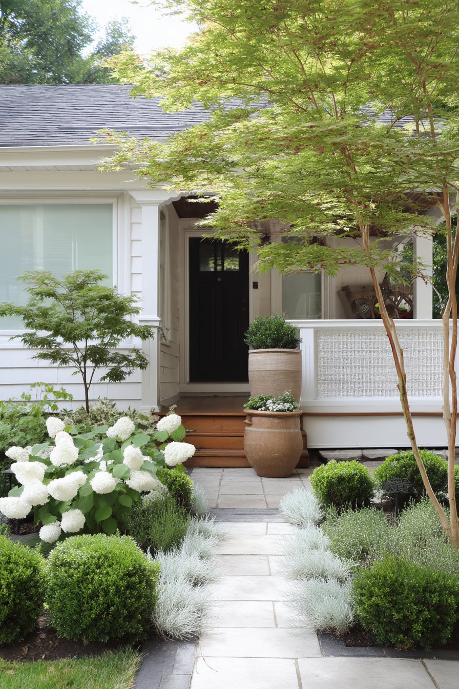 This garden beautifully combines the lush white hydrangeas with neatly trimmed boxwood, creating a balanced and inviting entrance. To replicate this look, consider using contrasting textures, like soft blue fescue grass alongside structured plants, for visual interest.