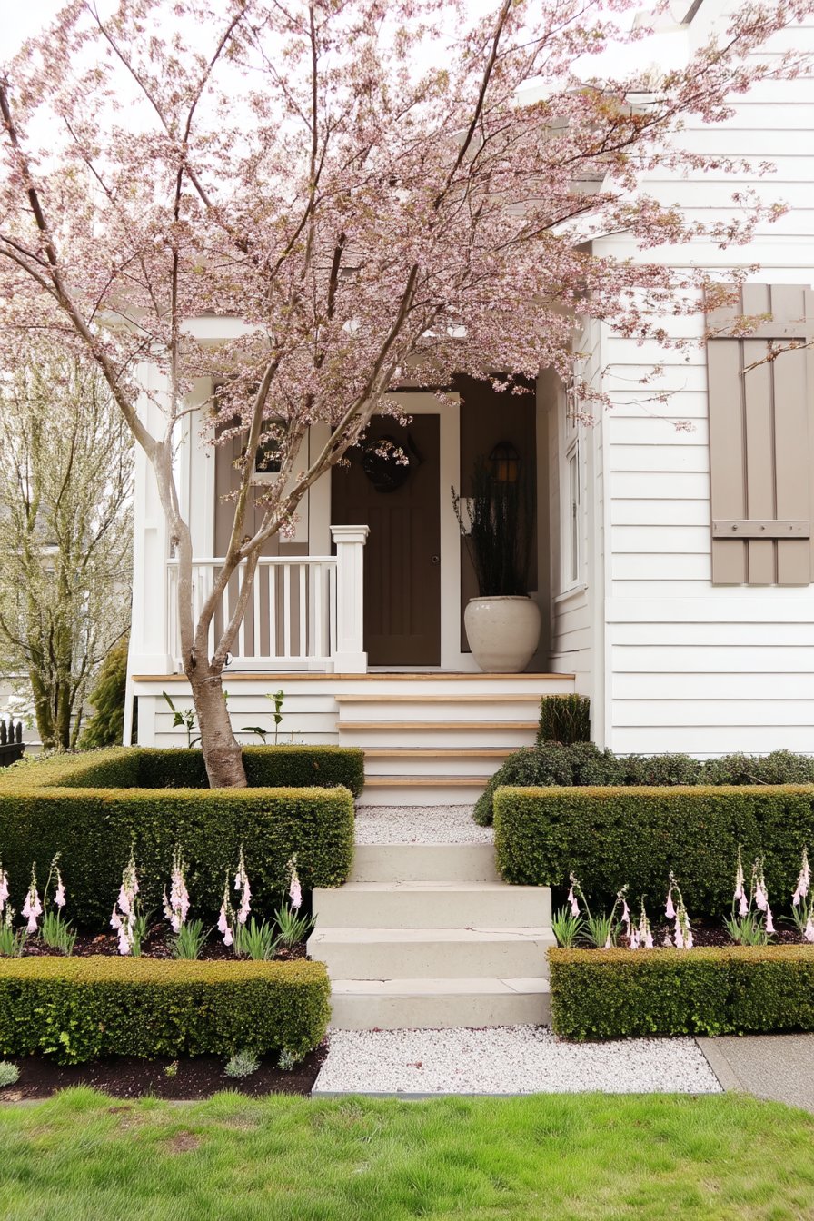 The sleek lines of boxwood hedges contrast beautifully with the delicate pink foxgloves, creating a modern yet inviting entrance. To replicate this look, combine structured greenery with seasonal blooms, ensuring varying heights for visual interest.