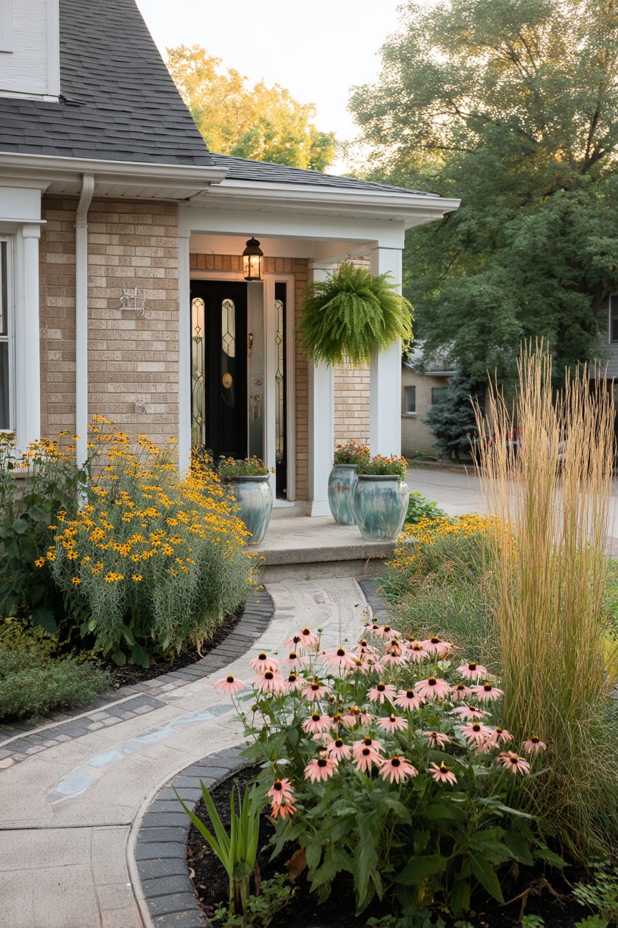 The vibrant mix of Black-eyed Susans and Echinacea creates a cheerful, inviting atmosphere, perfect for a cottage garden. To replicate this look, incorporate curved pathways and colorful planters to enhance visual interest and accessibility.
