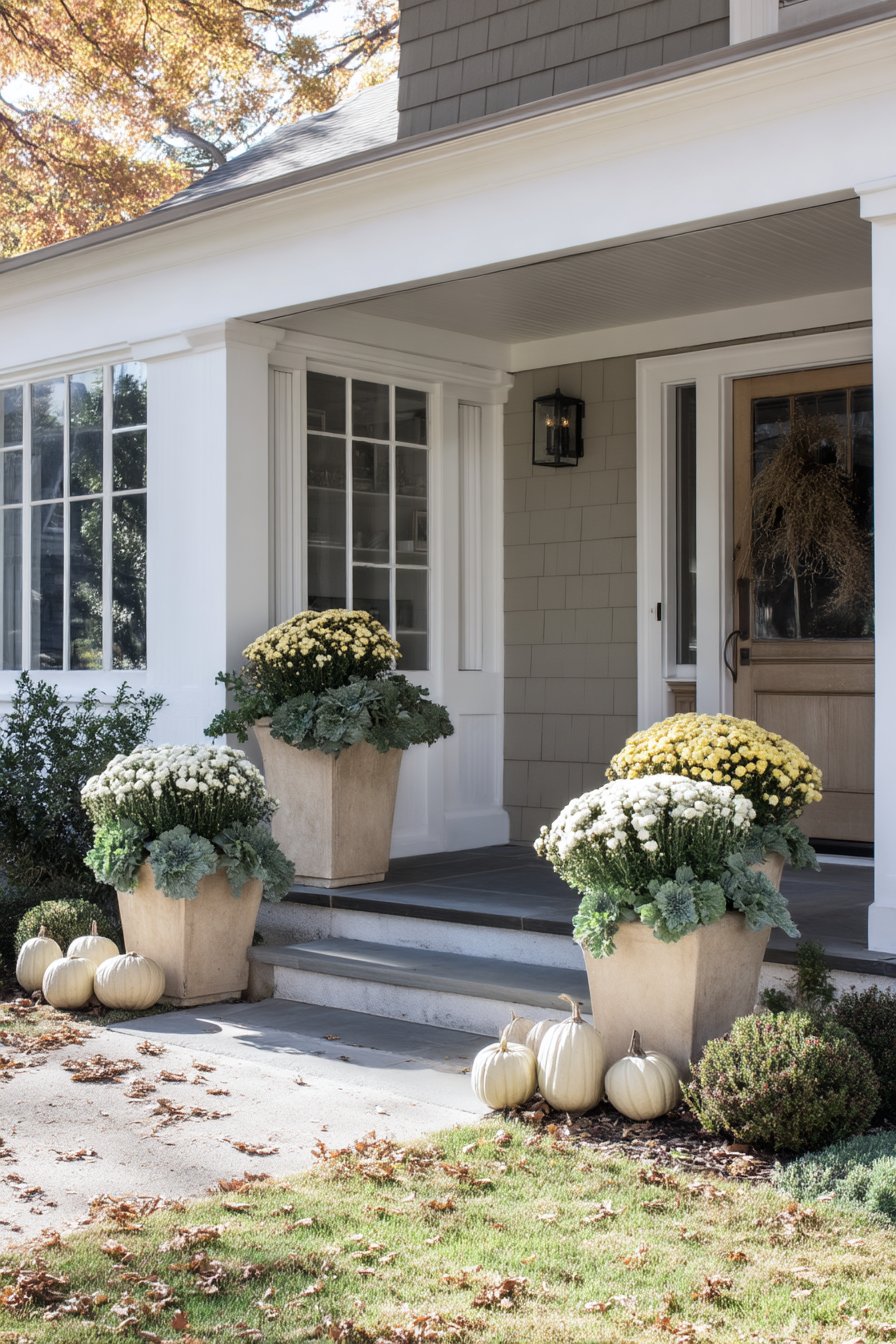 The warm hues of yellow and white chrysanthemums paired with lush kale create a vibrant seasonal display that welcomes autumn beautifully. For a similar look, use large planters and incorporate ornamental pumpkins for added texture and charm.