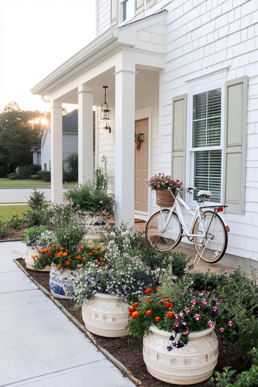 The vibrant combination of marigolds, petunias, and delicate creates a cheerful and inviting entrance that bursts with color. To replicate this look, use varied container sizes and shapes for visual interest, and choose plants that thrive in your local climate.
