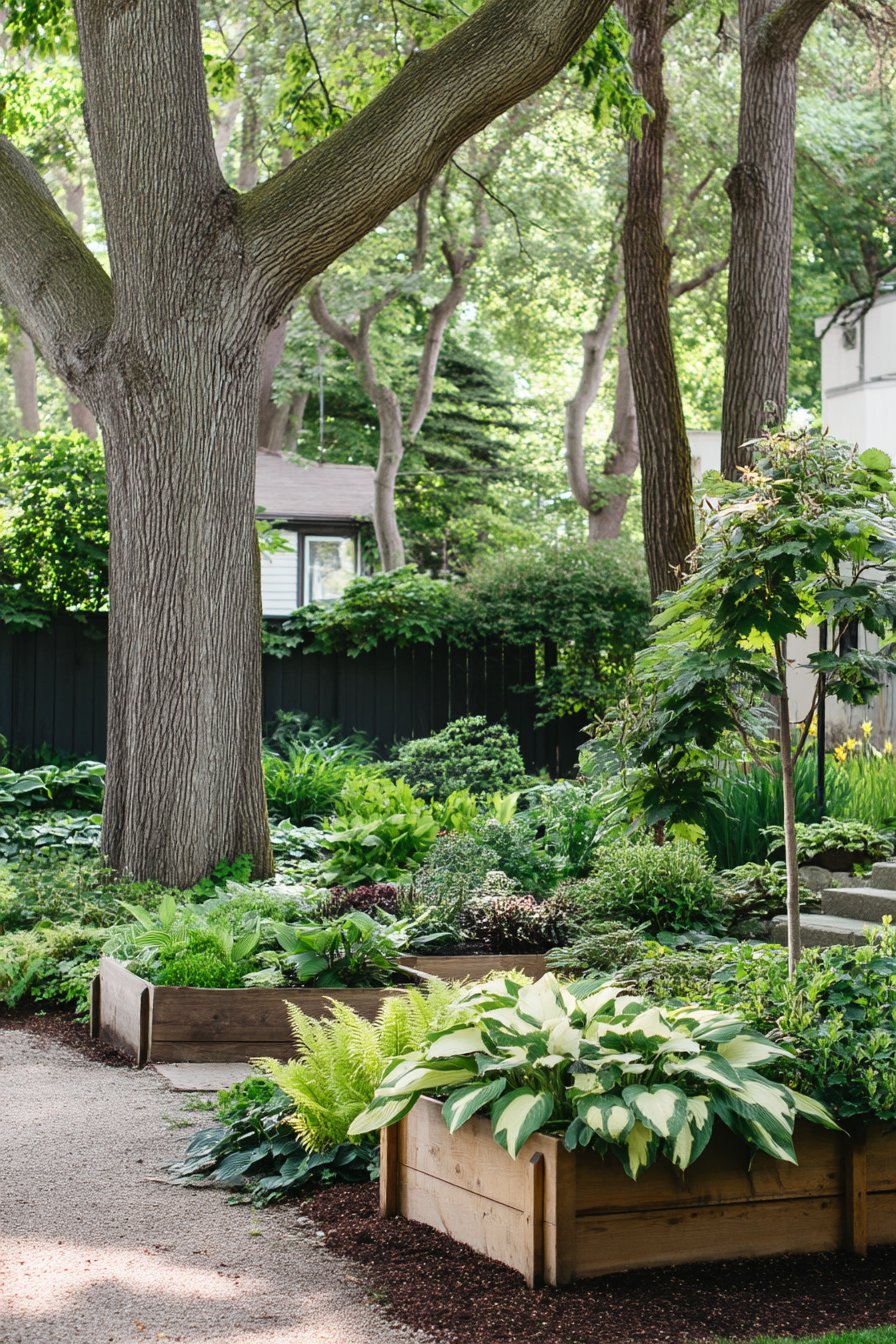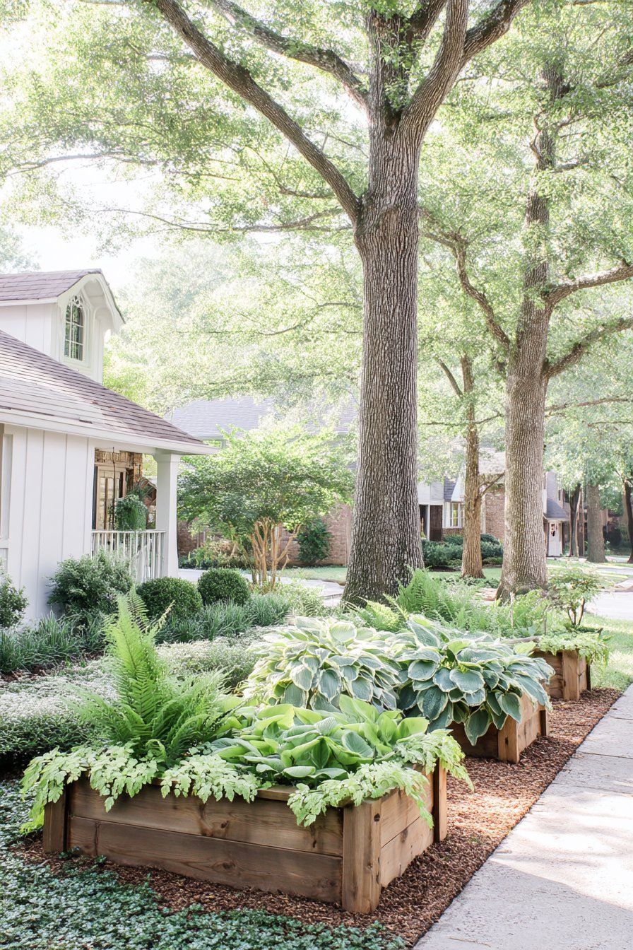 This showcases a vibrant tapestry of lush hostas and ferns, creating a serene retreat under the dappled shade of mature trees. To replicate this look, incorporate varied shades of green foliage and use raised beds for layered planting, enhancing texture and depth.
