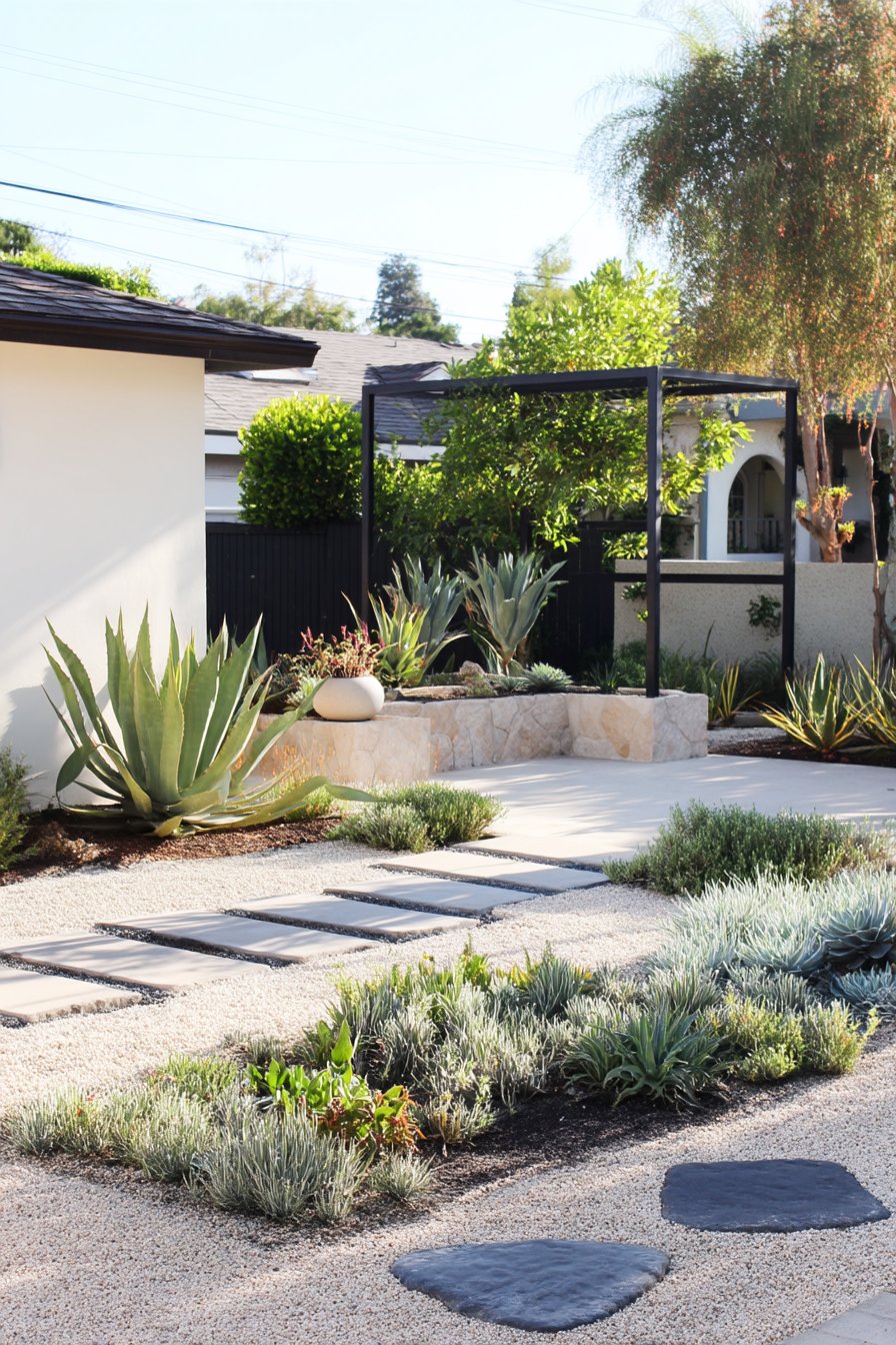This design features a harmonious blend of succulents like agave and lavender, paired with sleek stone pathways that create a modern, tranquil aesthetic. To replicate this look, incorporate drought-resistant plants and use gravel or sand for easy maintenance and a clean, contemporary feel.