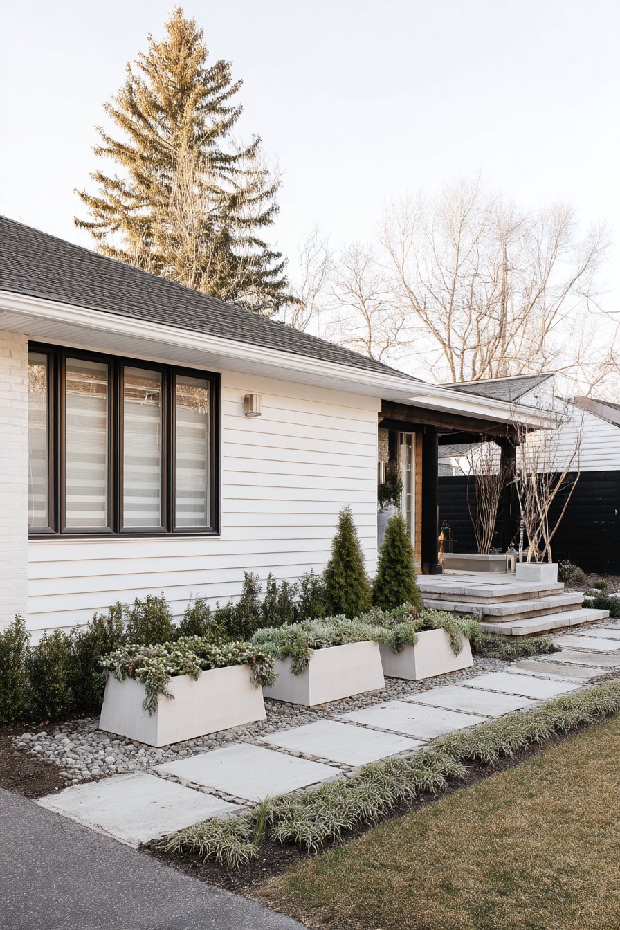 This design elegantly combines clean lines with lush greenery, featuring low-maintenance plants like sedums and boxwoods in modern concrete planters. To achieve a similar look, use a mix of structured evergreens and ground cover, and incorporate large, flat stepping stones for a sleek pathway.