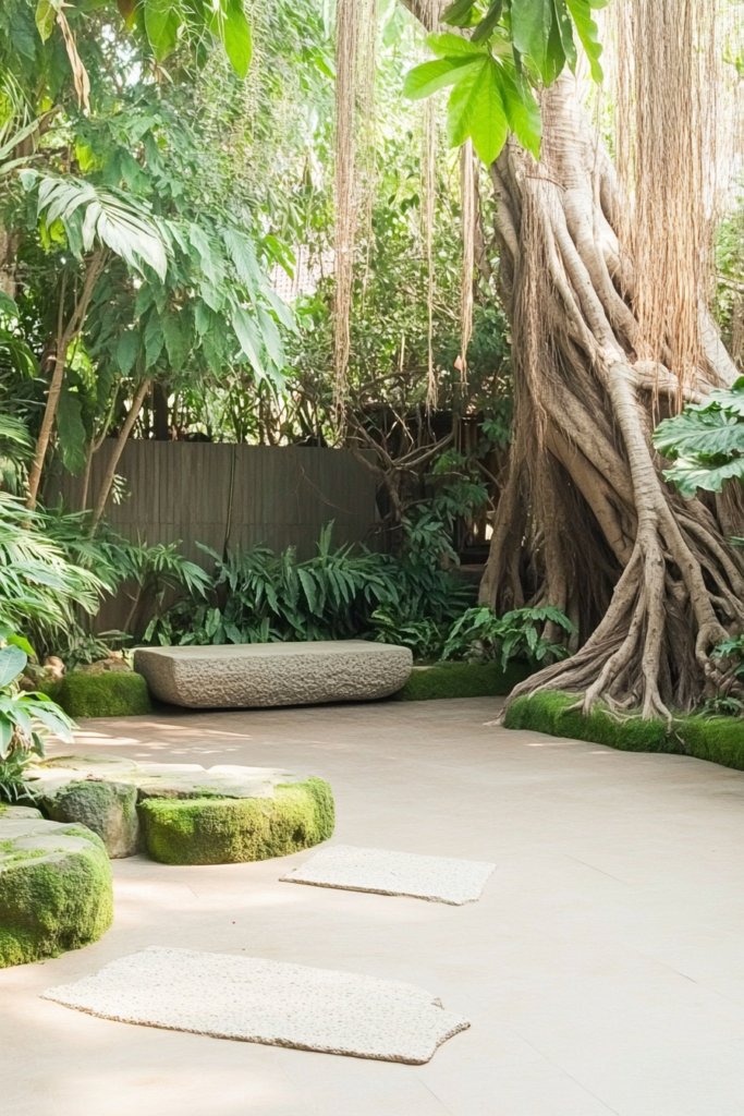 Create this tranquil escape with rich green layers, soft water sounds, and inviting seating.