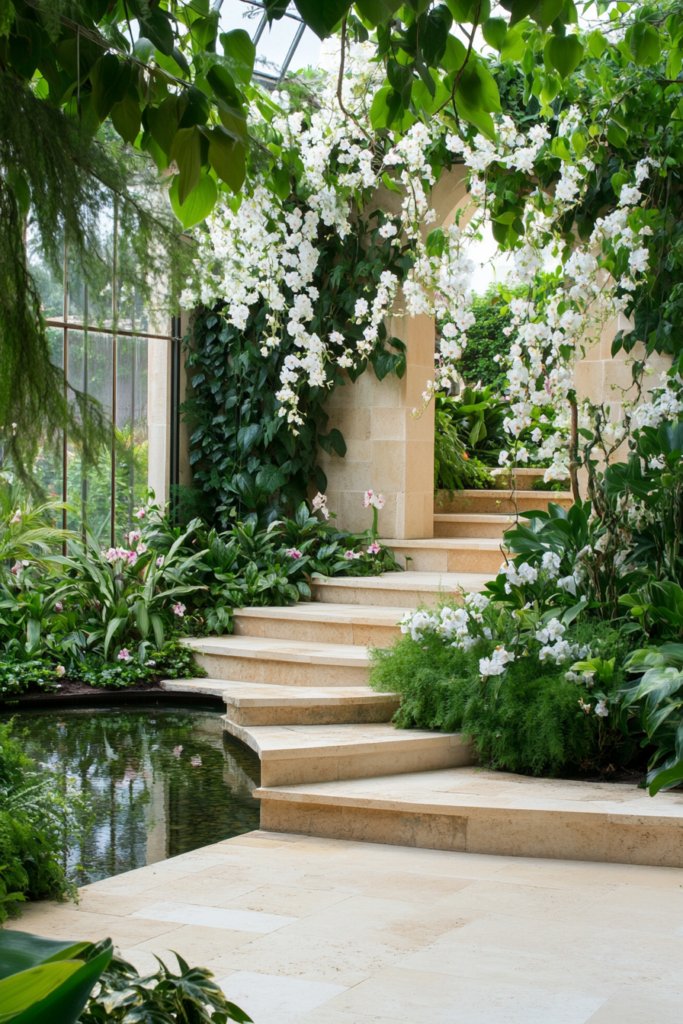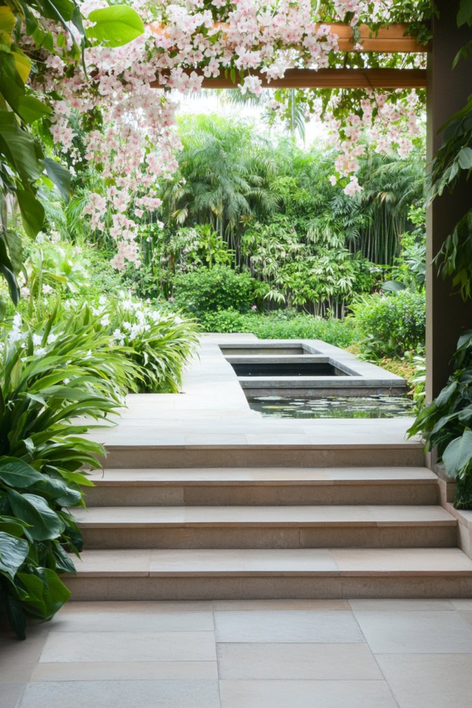 A romantic retreat draped in blooming orchids and trailing jasmine, with carved stone steps leading to a small meditation pond surrounded by lush greenery. Achieve this delicate, dreamy atmosphere with , natural stone accents, and an intimate water feature.