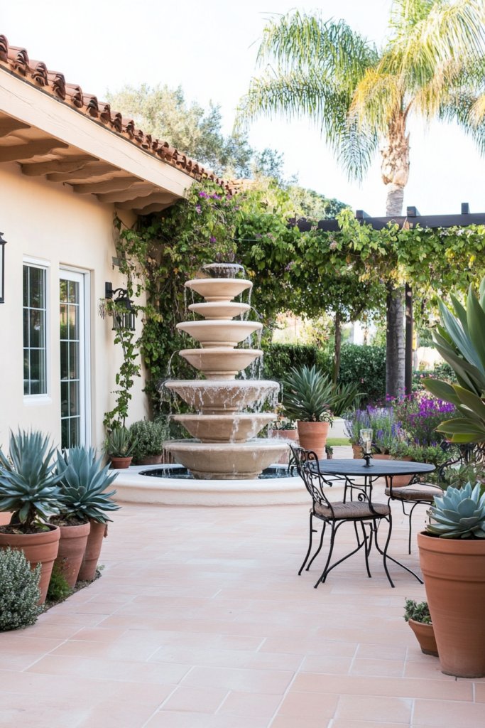 This warm Mediterranean-inspired courtyard features terracotta paving, potted palms, succulents, and cascading bougainvillea. A wrought iron bistro table sits beside a flowing tiered stone fountain, shaded by a grapevine-covered pergola. Recreate this inviting space with earthy textures, vibrant flowering vines, and classic European-style garden elements.