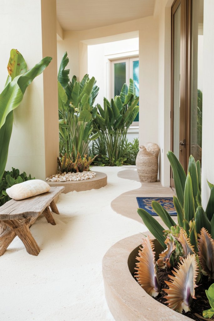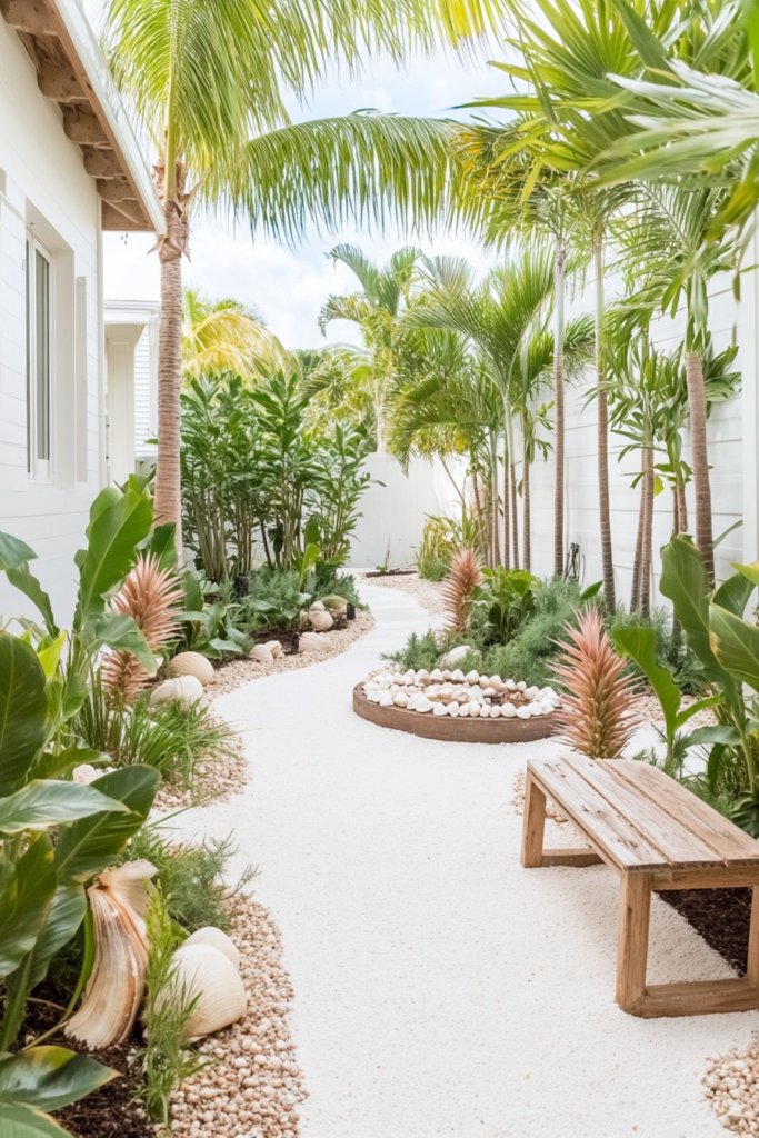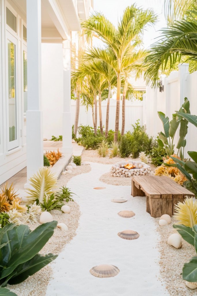A breezy beach-style courtyard with soft white sand pathways meandering through clusters of coconut palms, sea grapes, and colorful bromeliads. A driftwood bench sits beside a small shell-lined firepit, perfect for sunset gatherings.