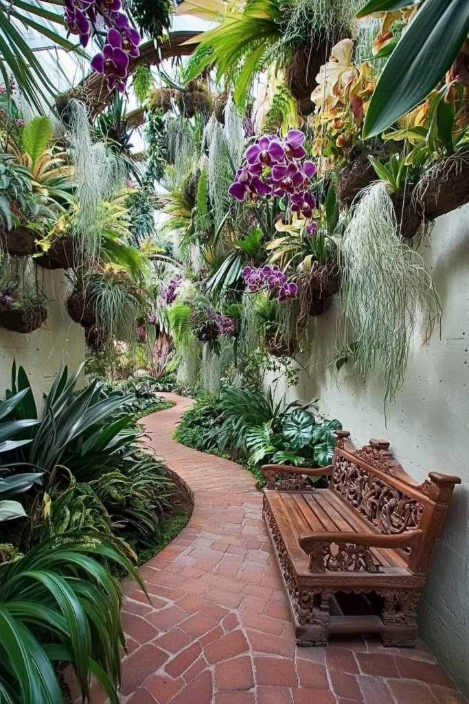 A multi-layered tropical sanctuary, filled with cascading orchids, air plants, and ferns suspended from pergolas and trellises. A winding brick pathway leads to a secluded hand-carved wooden bench, offering a quiet retreat.