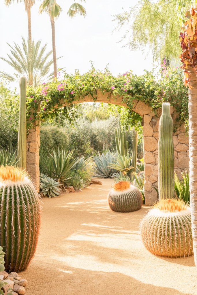 A striking fusion of tropical and aesthetics, featuring golden sand pathways winding between towering cacti, drought-resistant palms, and flowering aloe vera. A stone archway draped in vibrant bougainvillea adds a dramatic focal point.