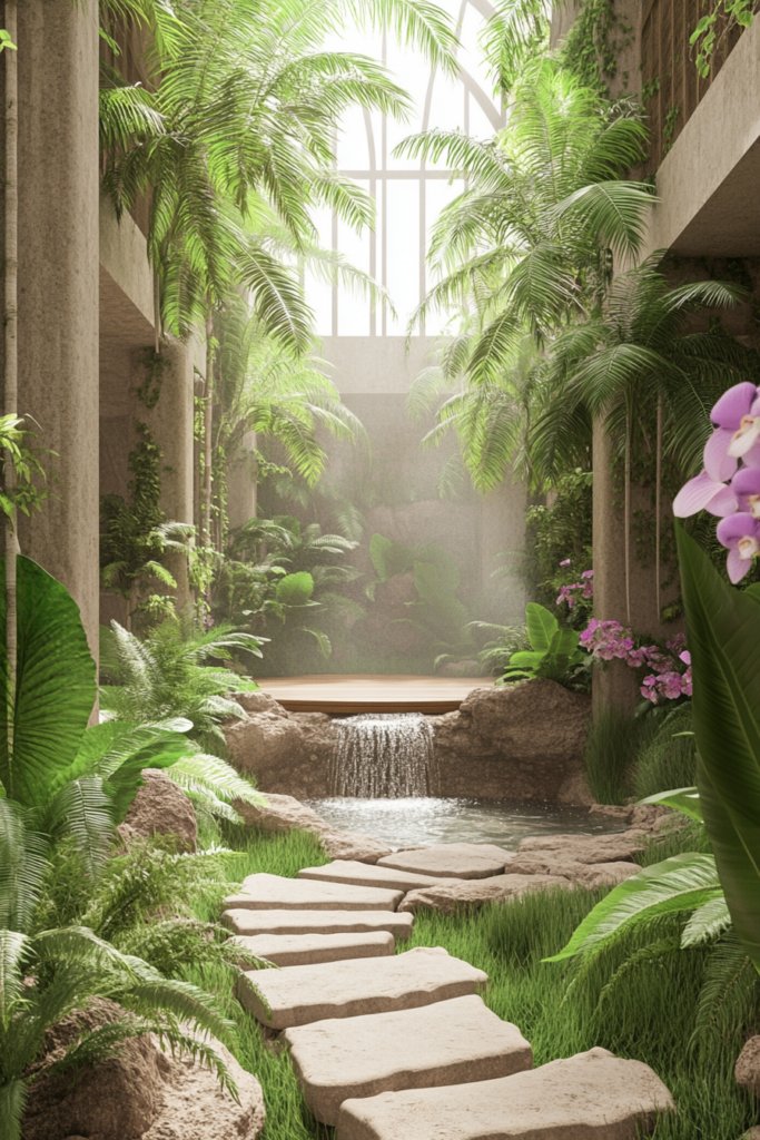 A lush, overgrown courtyard bursting with towering palms, giant ferns, and mist-covered orchids. A stone waterfall trickles into a natural rock pool, while a winding stepping-stone path leads to a secluded wooden meditation deck. Capture this untamed jungle look with dense, layered greenery and the sound of gently flowing water.