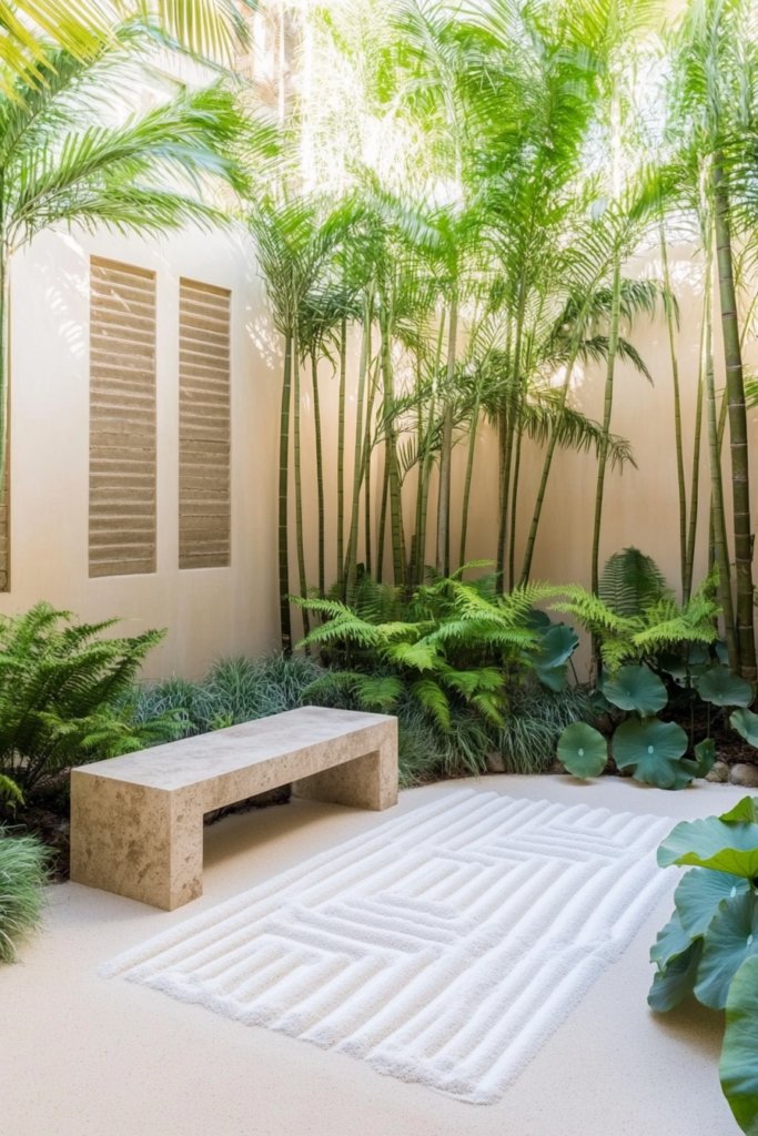 A tranquil Japanese-style courtyard infused with tropical elements, featuring bamboo, large ferns, and raked white sand in peaceful patterns. A minimalist stone bench sits beneath towering traveler’s palms, overlooking a serene lotus pond. Recreate this calming space with simple design, natural materials, and an emphasis on harmony and balance.