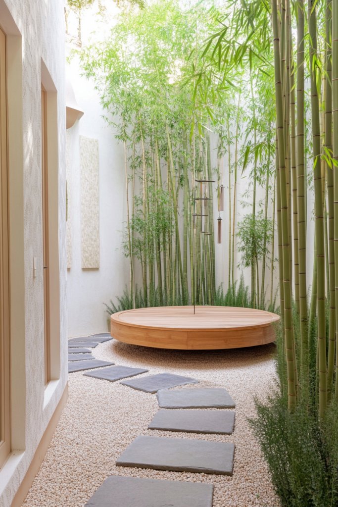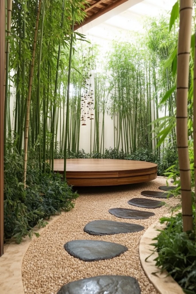 To achieve this zen-like space, incorporate smooth stone pathways, minimalist wooden structures, and the gentle rustling of bamboo in the breeze.