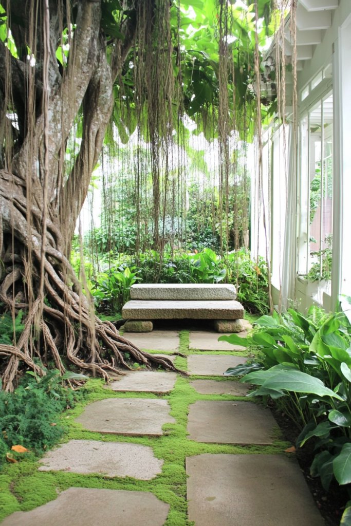 A mystical courtyard hidden within an overgrown jungle, where twisted tree roots and moss-covered stones create a magical atmosphere. A winding path leads to a secluded stone bench nestled beneath an ancient banyan tree.