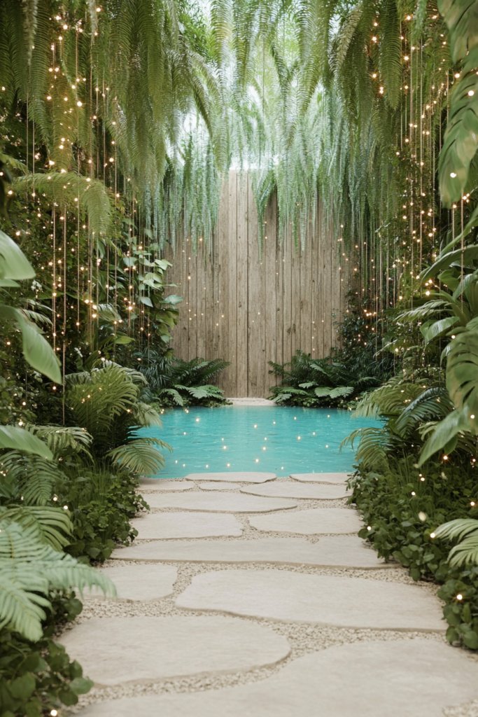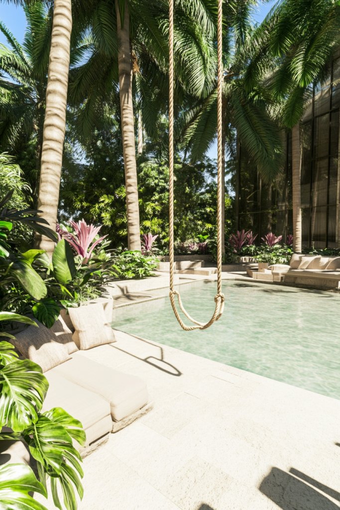 Bring this tropical paradise to life with bold foliage, natural water features, and interactive elements like swings or hammocks.