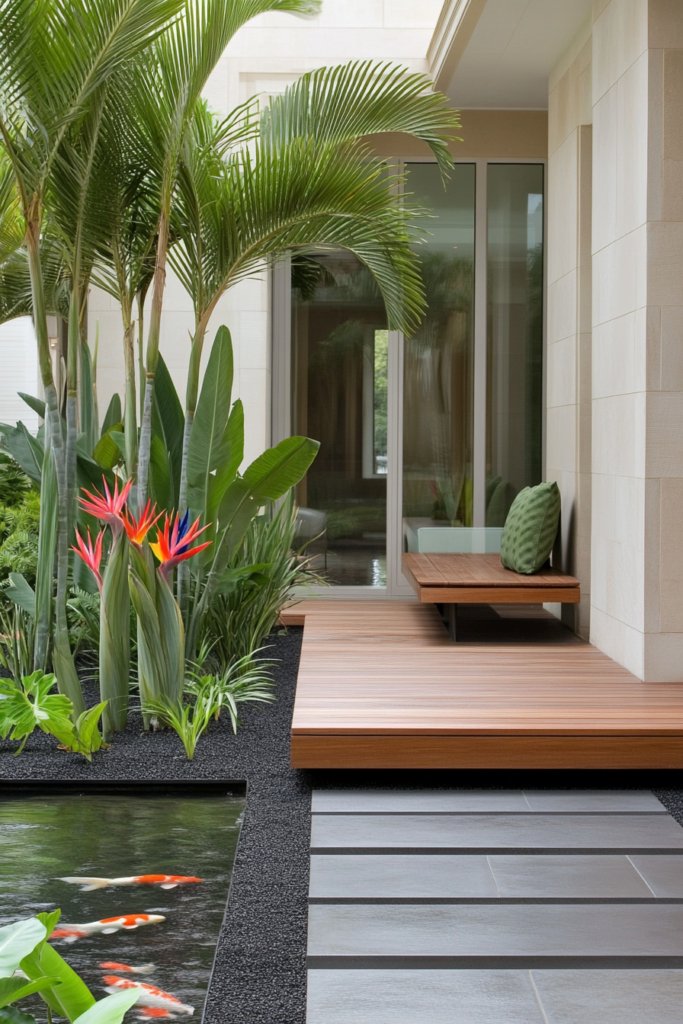 A contemporary tropical oasis, this courtyard features tall fan palms and striking bird of paradise plants arranged around a minimalist black lava stone pathway. A floating wooden deck with a teak bench offers peaceful seating beside a reflective koi pond. Achieve this sleek, modern look with bold plant choices, natural materials, and clean, geometric lines.