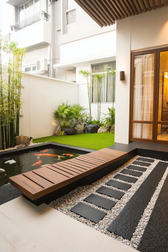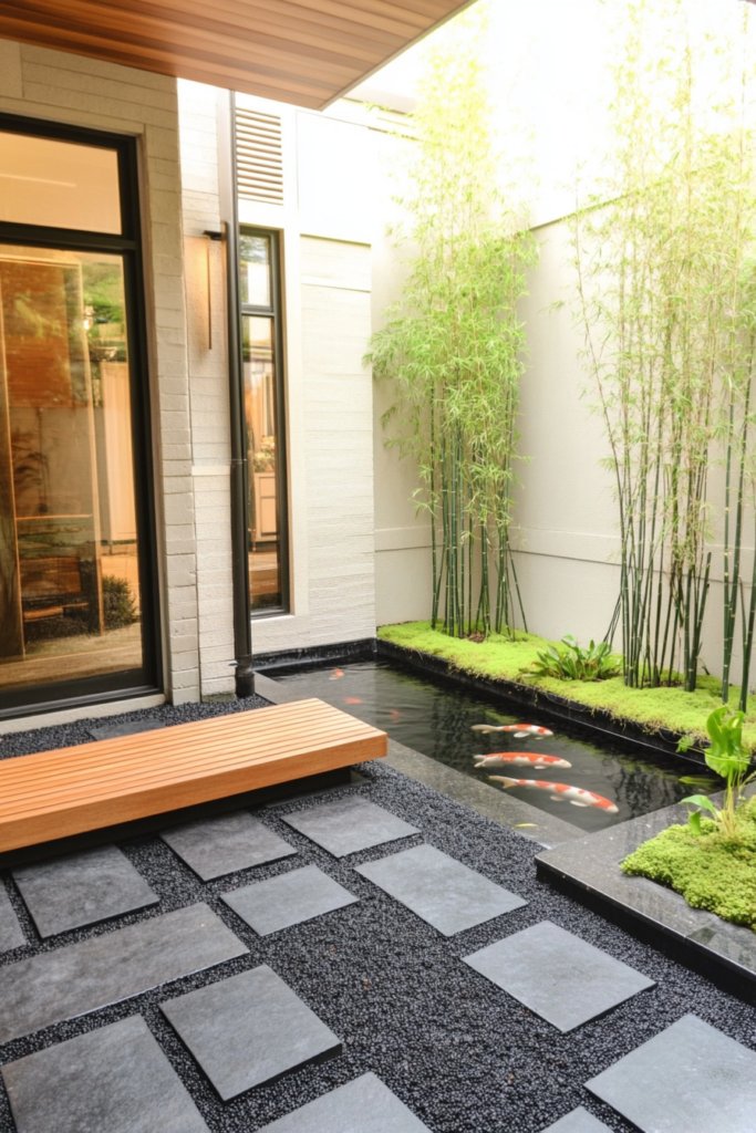 A sleek modern courtyard blends black lava stones, soft moss, and bamboo for a tranquil atmosphere. A low floating wooden bench provides a meditative resting spot beside a small koi pond, while monochrome pebble pathways add to the minimalist aesthetic. Capture this calming retreat with simple, structured landscaping and a muted color palette.
