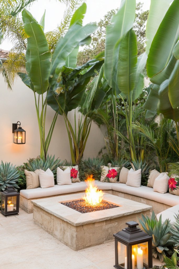 A cozy tropical escape, this courtyard is framed by towering banana leaves, colorful hibiscus, and sculptural agave plants, all centered around a stone fire pit with built-in seating. Warm twinkling lanterns add an inviting glow. Recreate this lively setting with bold tropical foliage, earthy stonework, and soft ambient lighting.