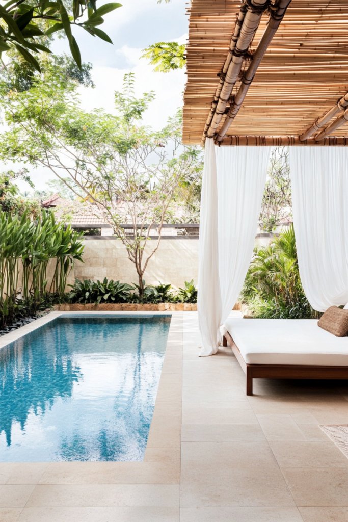 This lush Balinese-style courtyard is a serene retreat, featuring a tranquil infinity pool surrounded by frangipani trees, bamboo, and elephant ear plants. A low teak daybed with flowing white curtains sits beneath a rustic bamboo pergola, offering a dreamy lounging space.