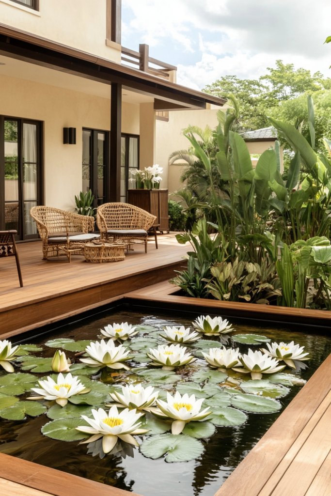 A vibrant, water-focused courtyard, where a large pond is covered in floating water lilies and bordered by ginger plants, monstera, and ferns. A wooden deck with woven chairs provides a peaceful space to overlook the serene water. Recreate this look with lush aquatic plants, reflective water surfaces, and natural wooden elements for a Zen-inspired retreat.