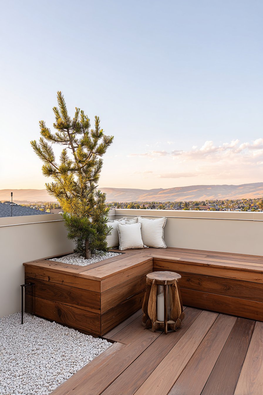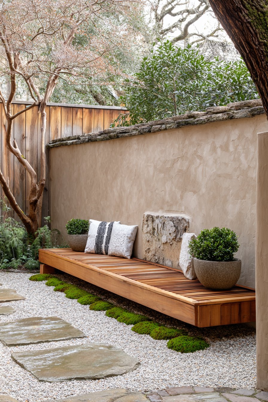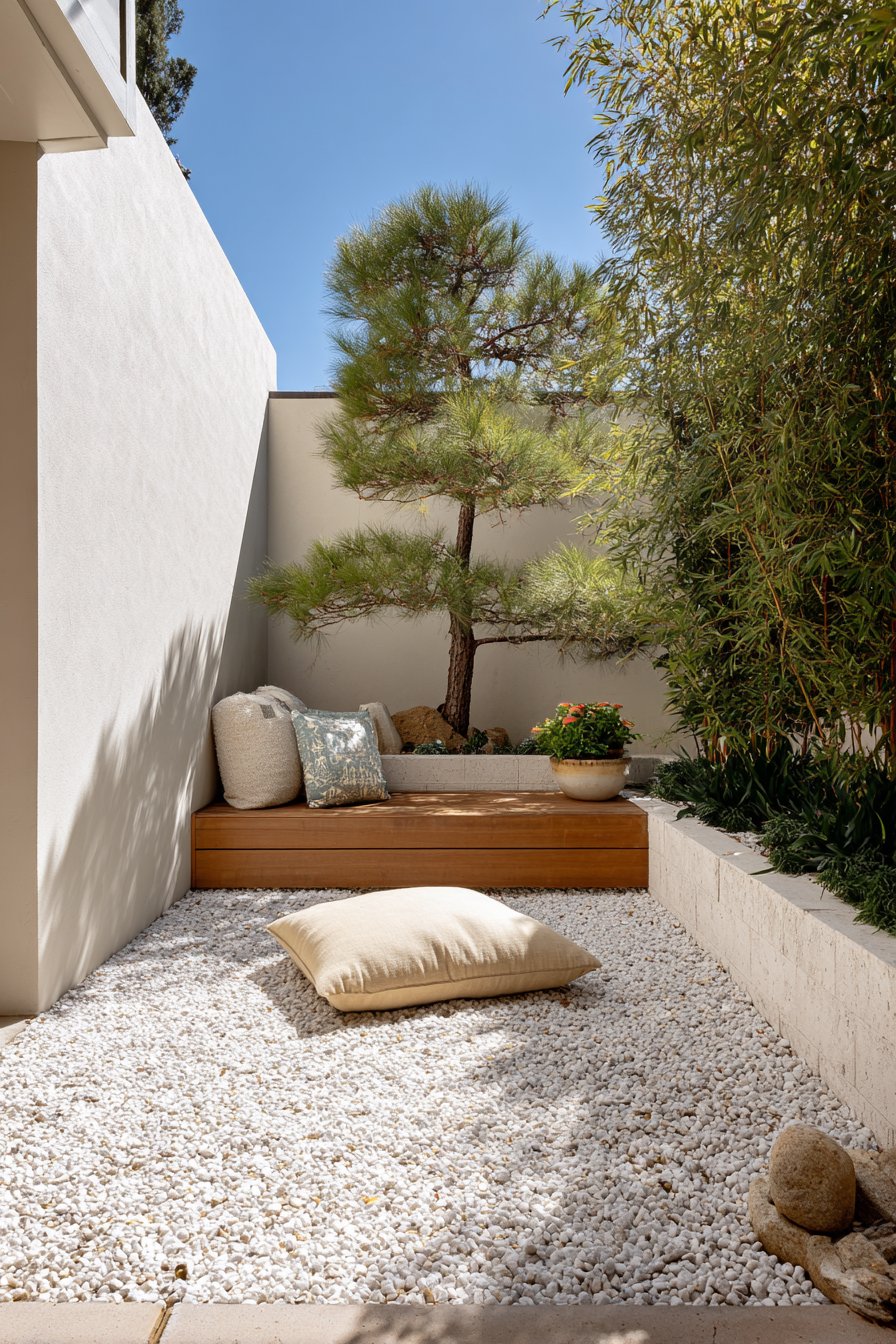 The serene blend of natural wood and soft white gravel creates a tranquil atmosphere, inviting relaxation and mindfulness in any outdoor space. To achieve this look, incorporate minimalist furniture and thoughtfully placed plants that enhance the garden’s simplicity and elegance.