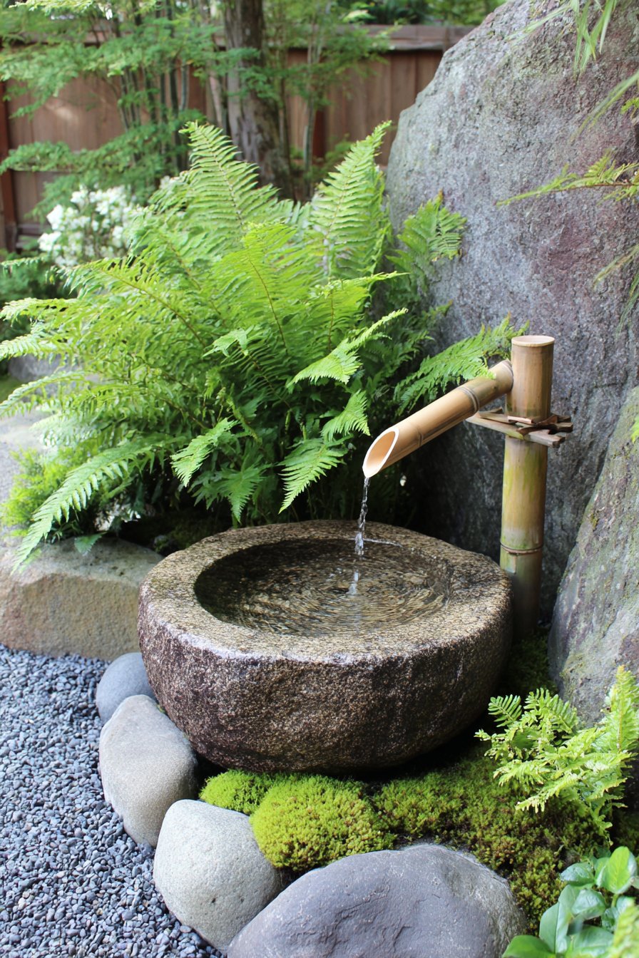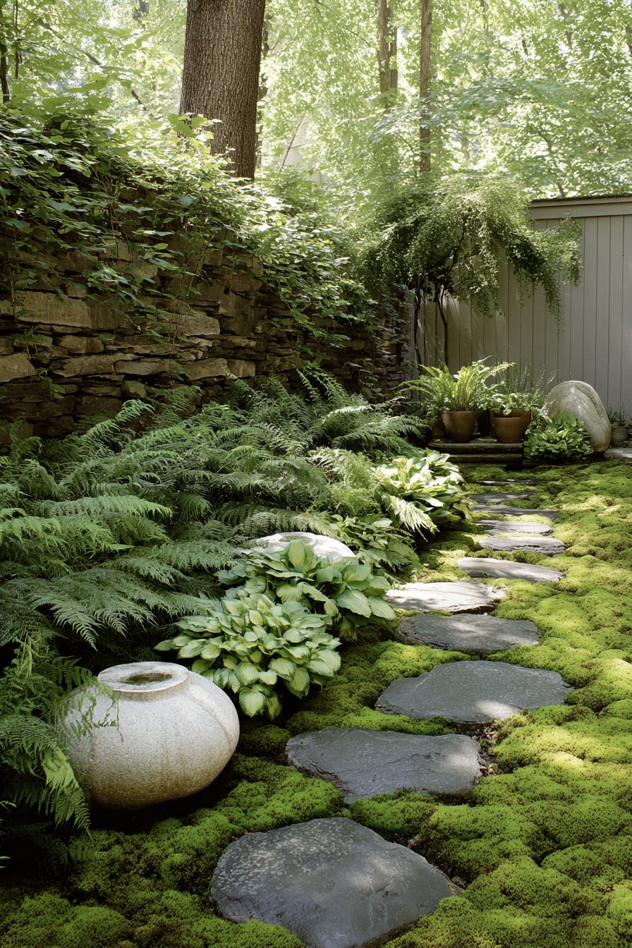For planting, consider using Japanese painted ferns, hostas, and moss for a lush, layered effect.