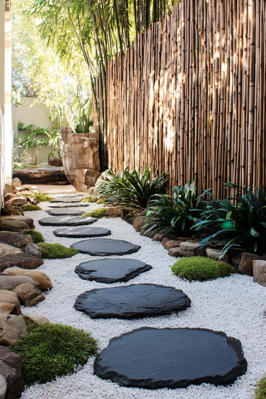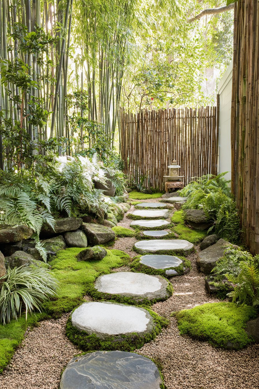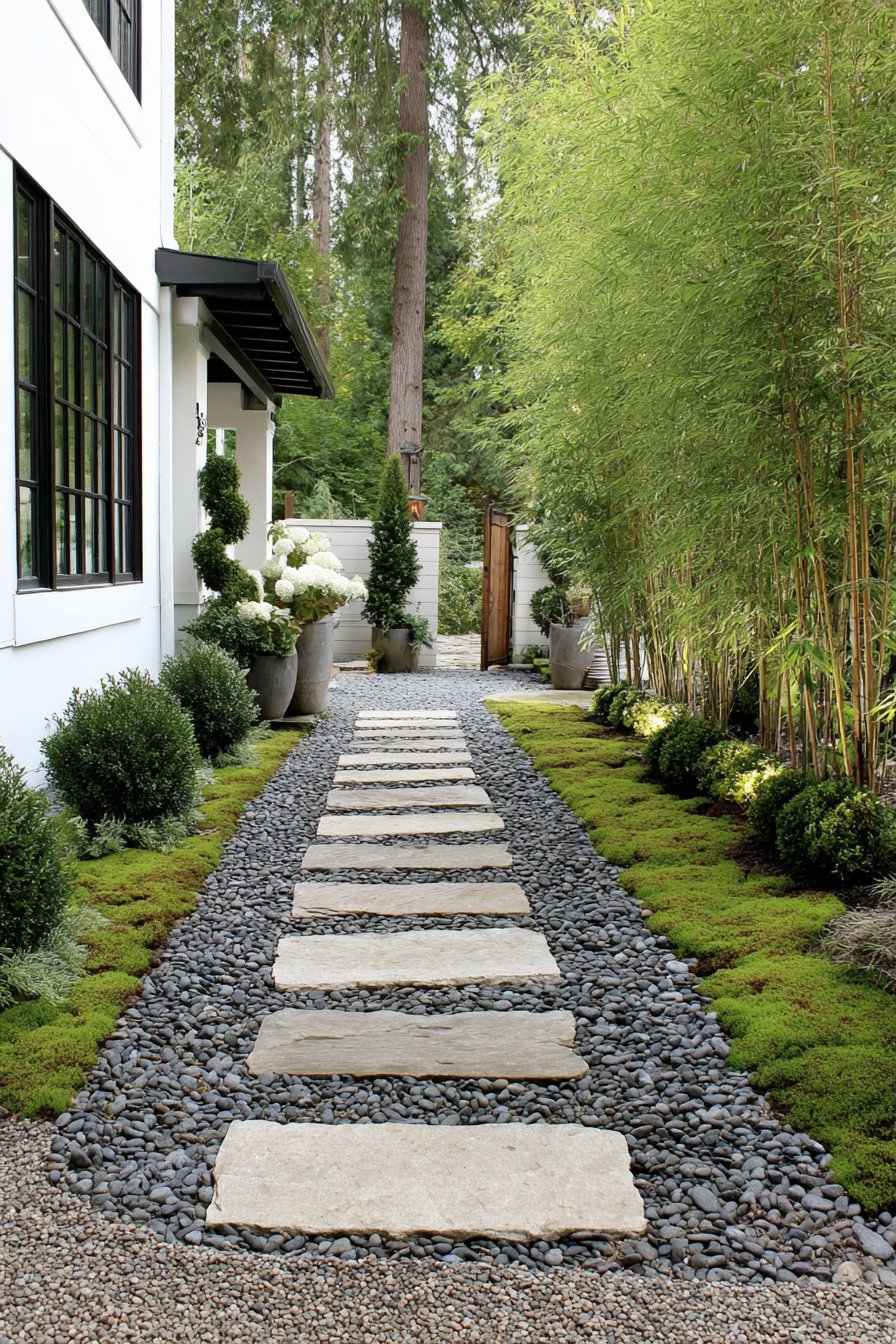 The serene stone pathway, framed by bamboo, creates a tranquil retreat, while the contrasting textures of gravel and moss enhance the calming atmosphere. Incorporate large stones, lush ferns, and graceful grasses to evoke a harmonious Zen-inspired garden.