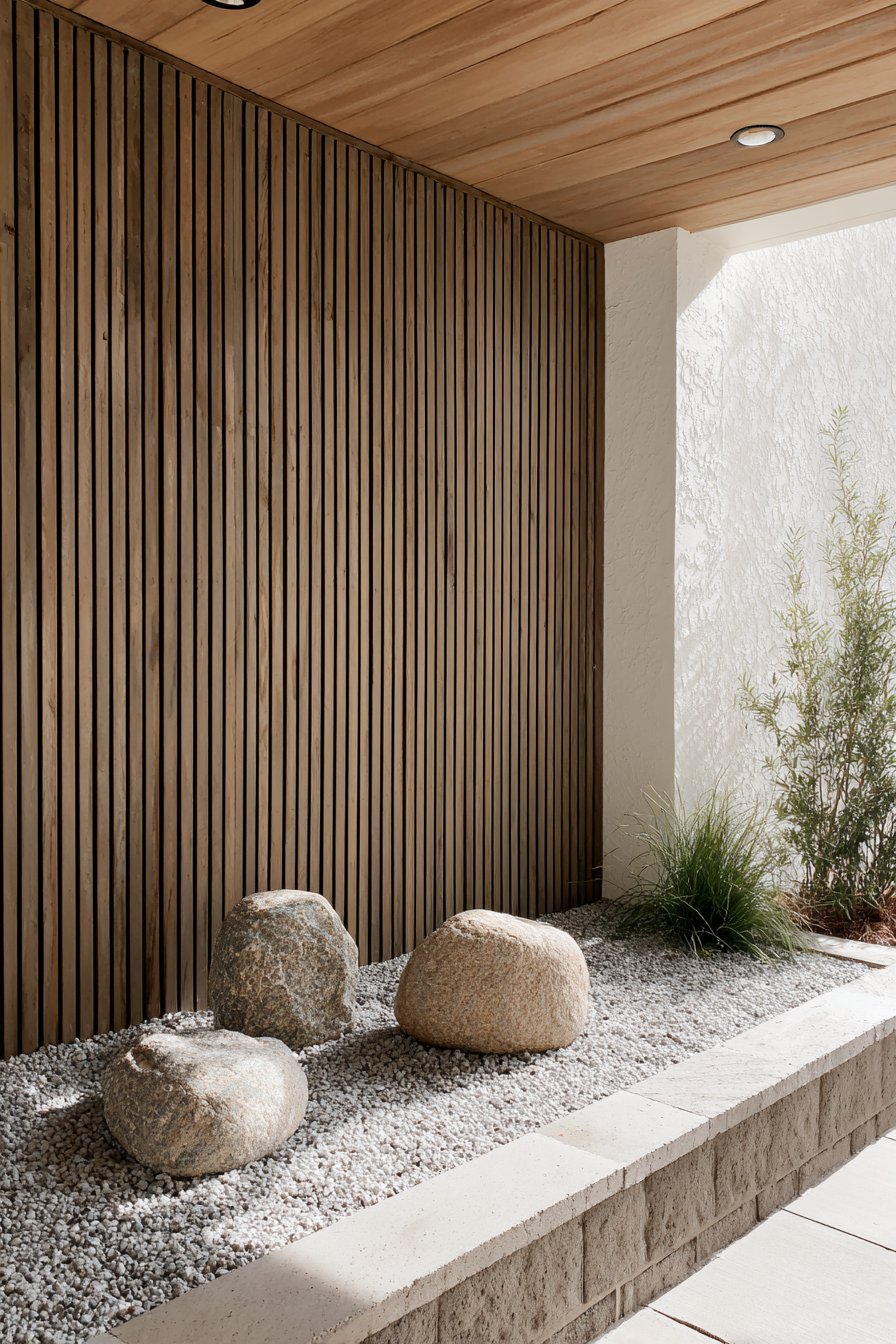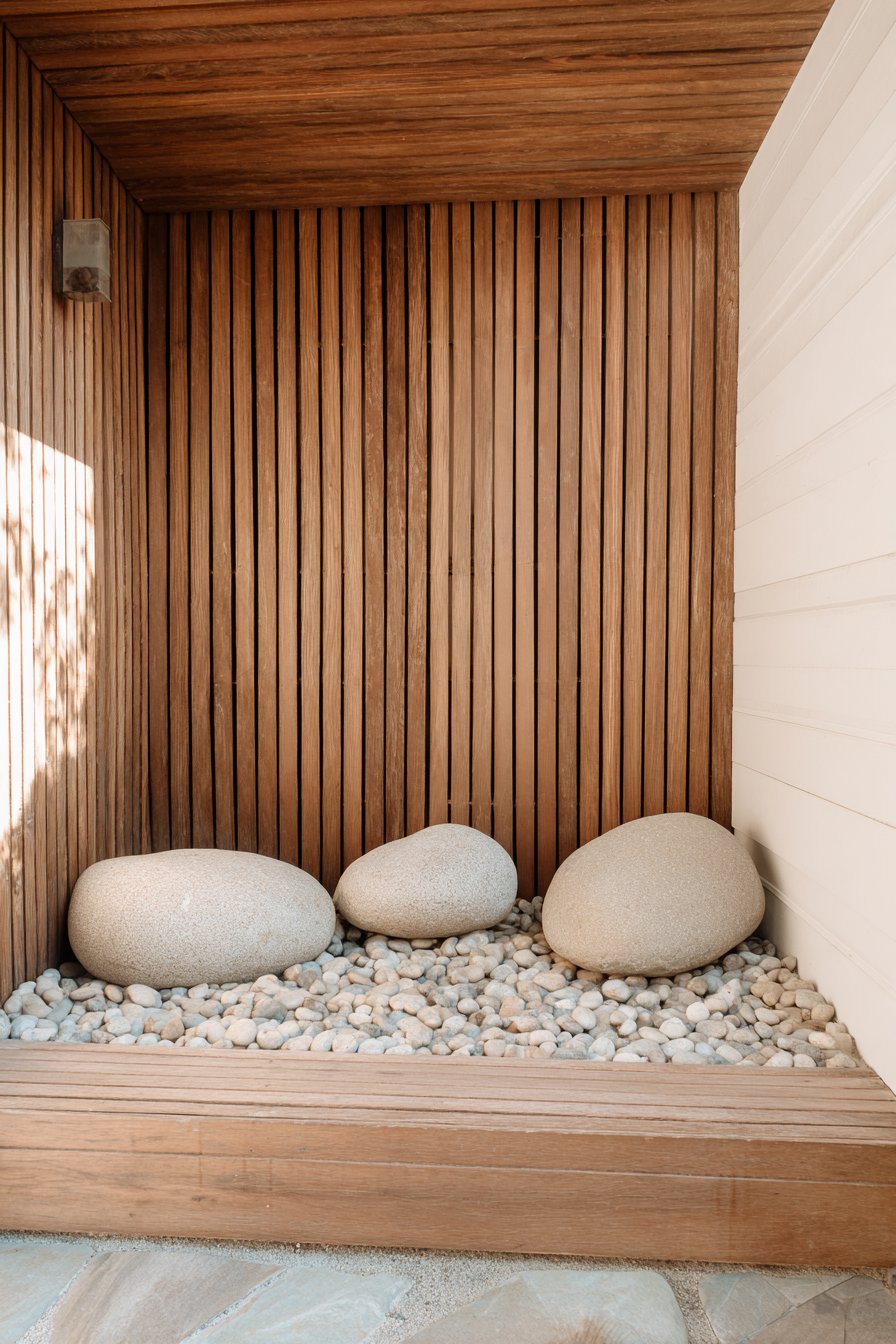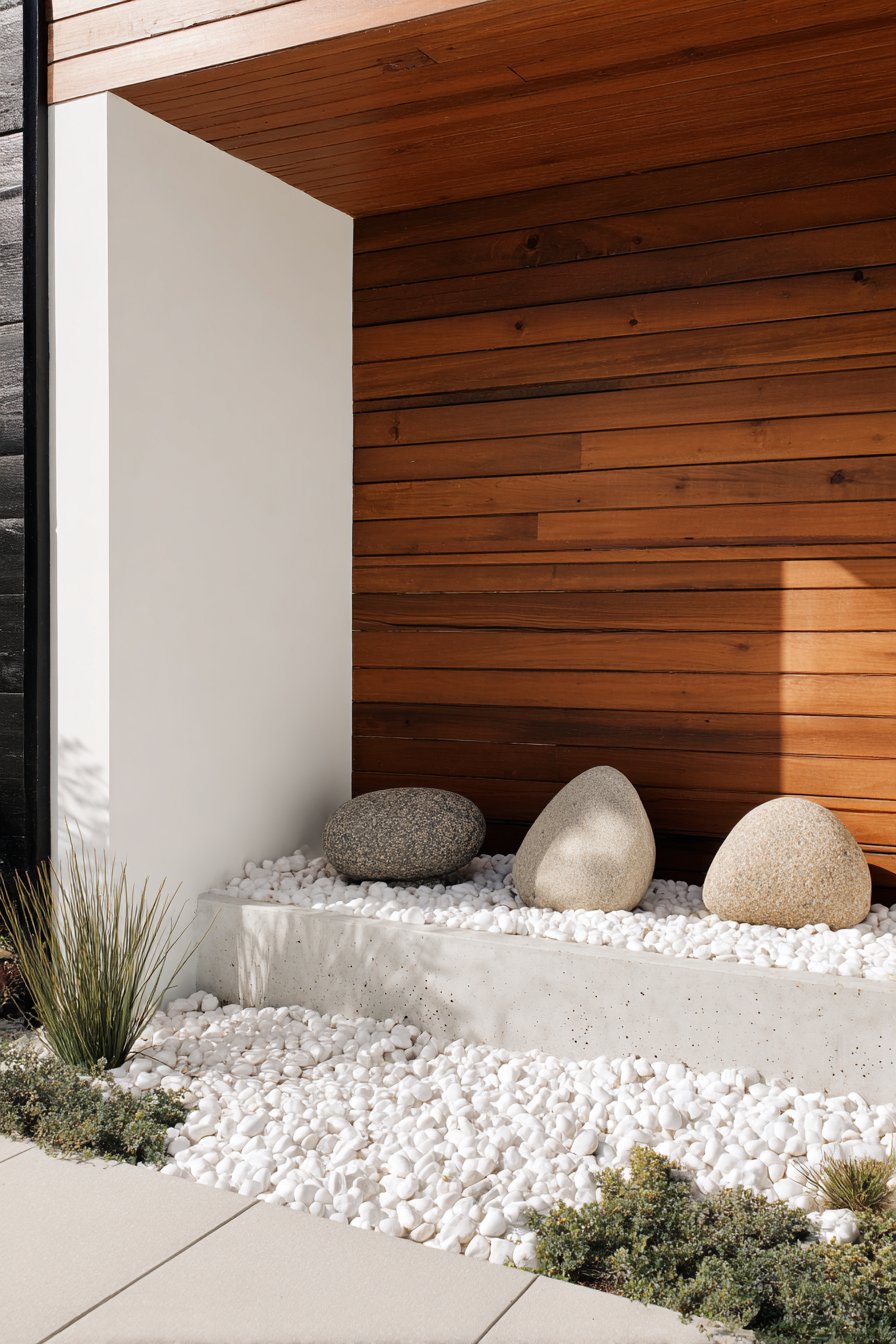 The serene combination of white stones and smooth boulders creates a tranquil atmosphere, beautifully contrasted by the warm wooden backdrop. To achieve a similar style, incorporate clean lines and minimalistic elements while using a mix of textures for visual interest.