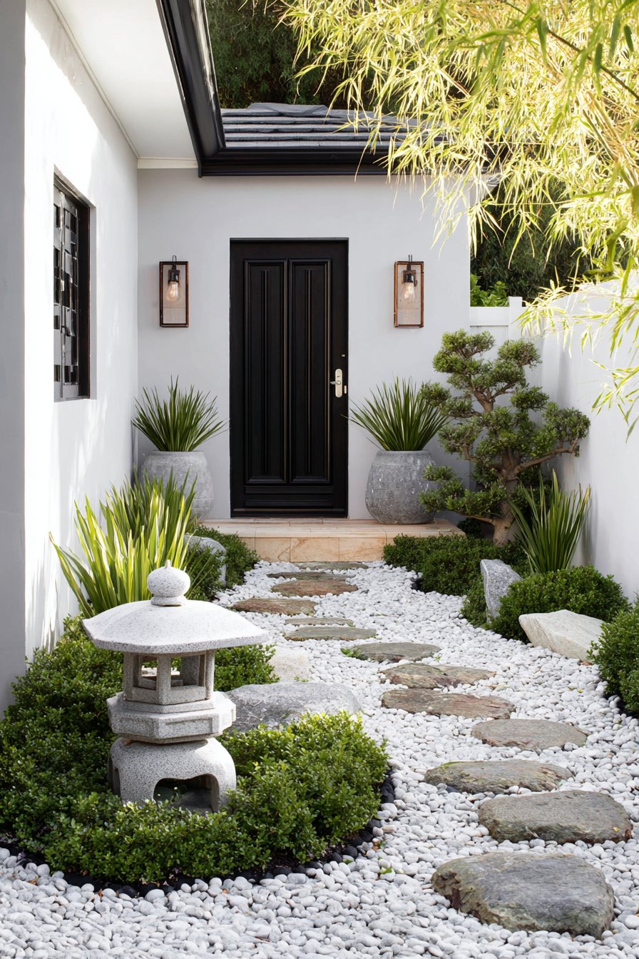 To recreate this look, include varieties like Japanese Boxwood (Buxus microphylla) for low hedges, and ornamental grasses such as Blue Fescue (Festuca glauca) for texture. Add a stone lantern for an authentic touch and soft lighting.