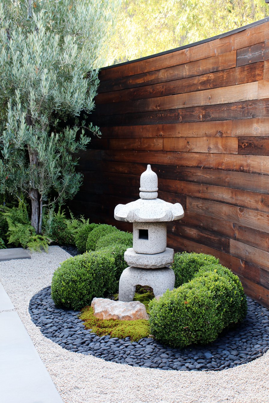 The harmonious blend of textures in this Zen garden, featuring smooth stones and lush greenery, creates a tranquil retreat perfect for meditation. Incorporating a minimalist stone lantern and carefully shaped boxwoods enhances the serene aesthetic, inviting relaxation and contemplation.