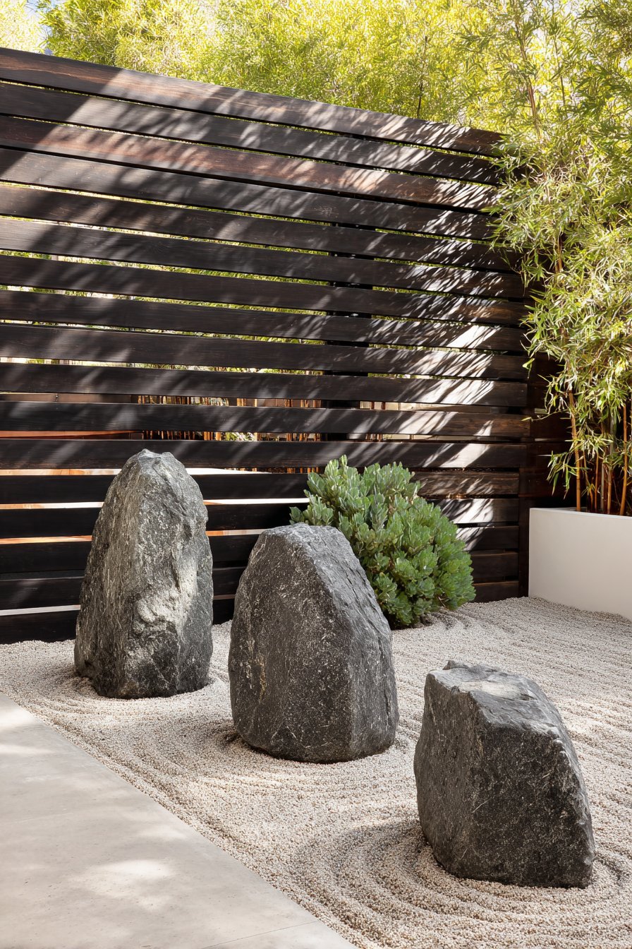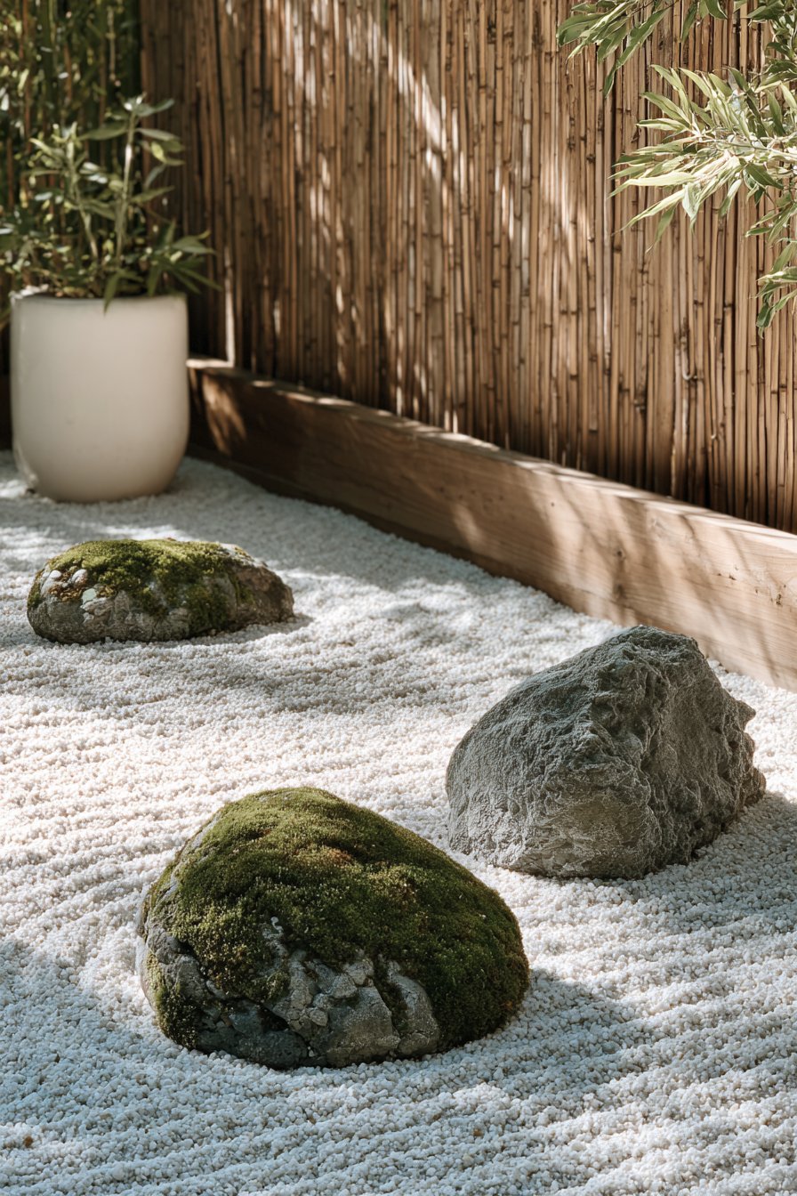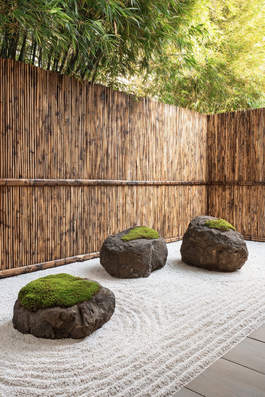 The serene blend of textured rocks and smooth sand creates a calming atmosphere, inviting reflection and tranquility into the space. Incorporate bamboo for lush greenery and subtle fencing to enhance privacy while maintaining a minimalist aesthetic.