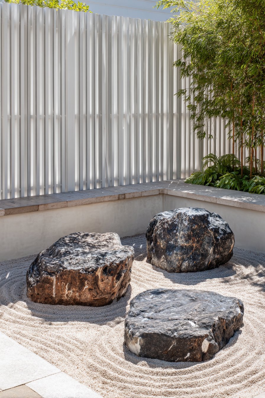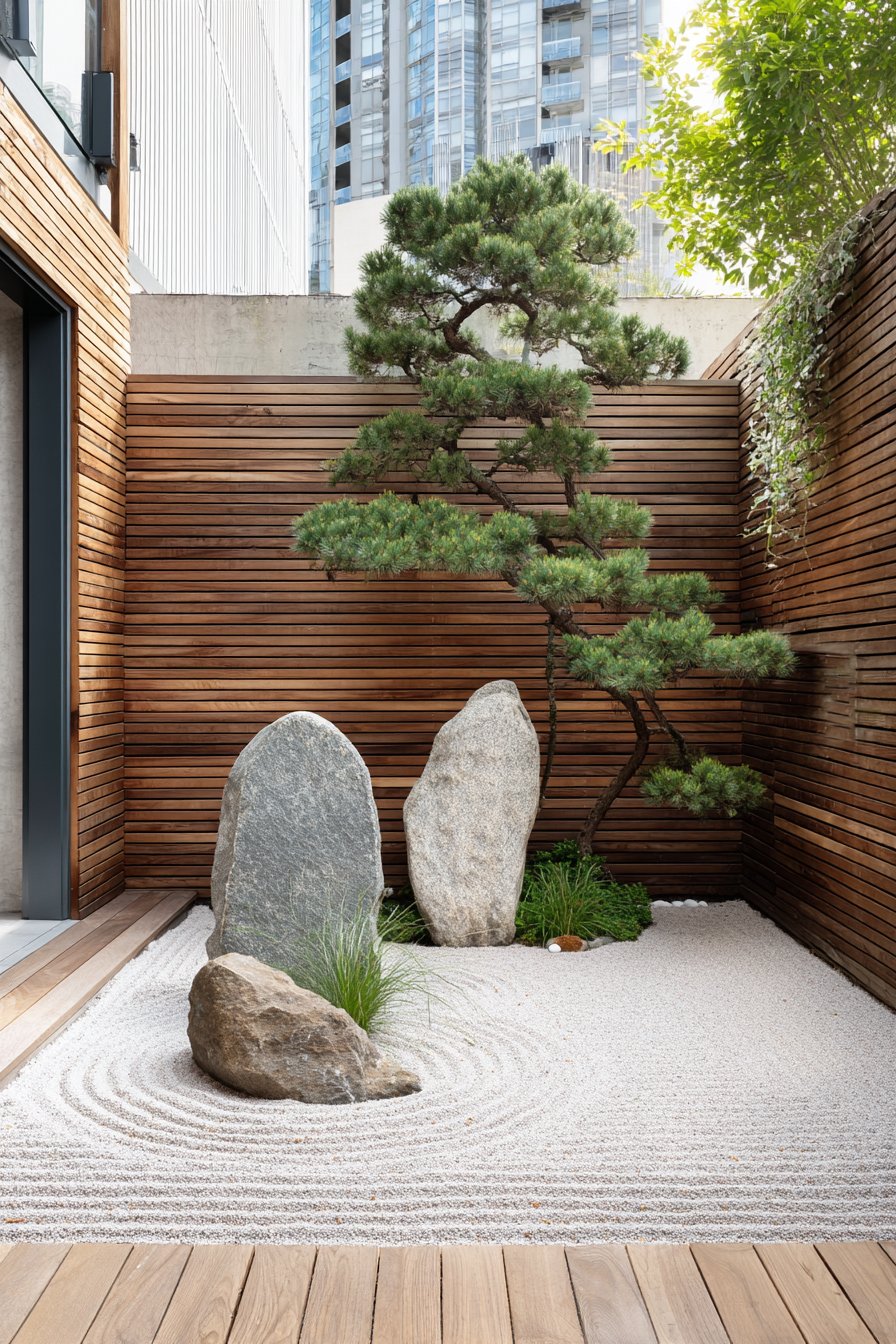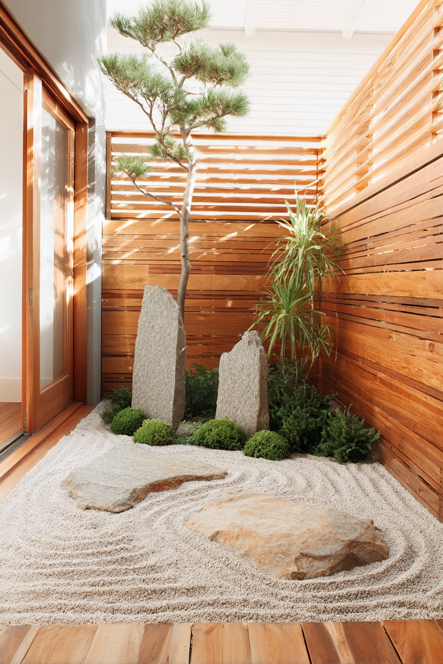 The serene blend of textured rocks and smooth sand creates a calming atmosphere, inviting reflection and tranquility into the space. Incorporate bamboo for lush greenery and subtle fencing to enhance privacy while maintaining a minimalist aesthetic.