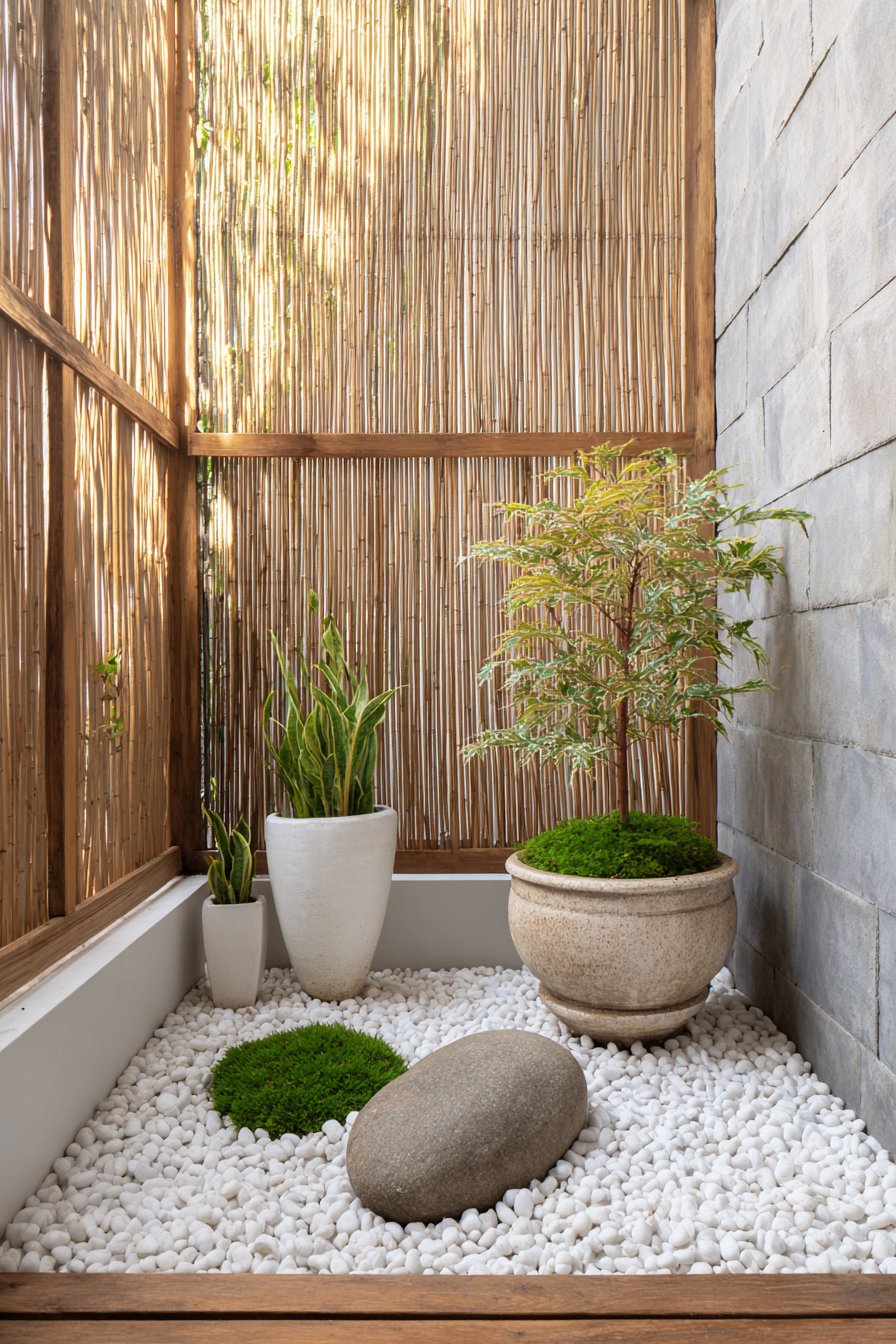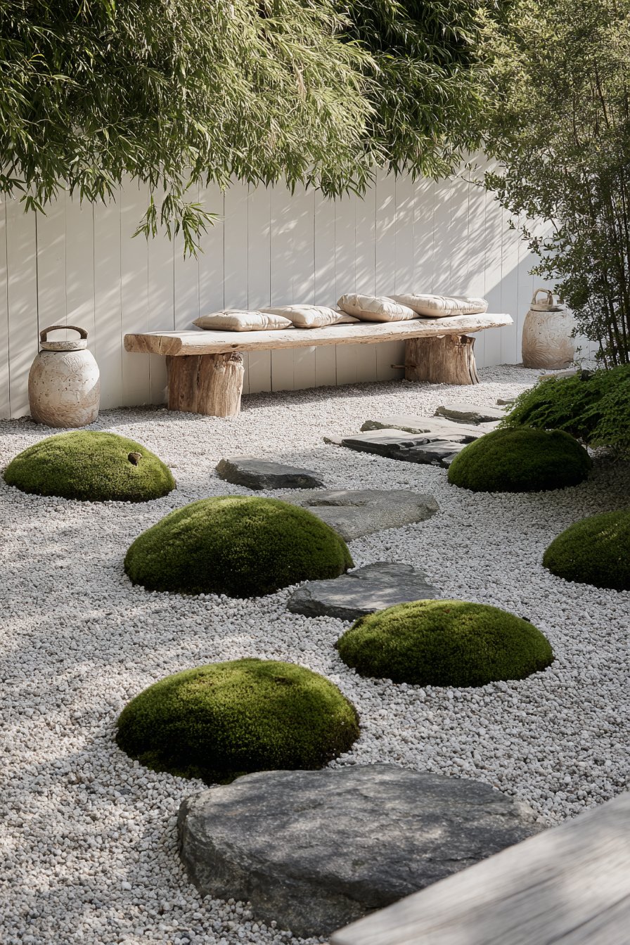 The serene blend of white pebbles and lush greenery creates a tranquil oasis, inviting relaxation and contemplation in any space. Incorporating natural textures, such as bamboo fencing and stone accents, enhances the minimalist aesthetic while promoting a peaceful atmosphere.