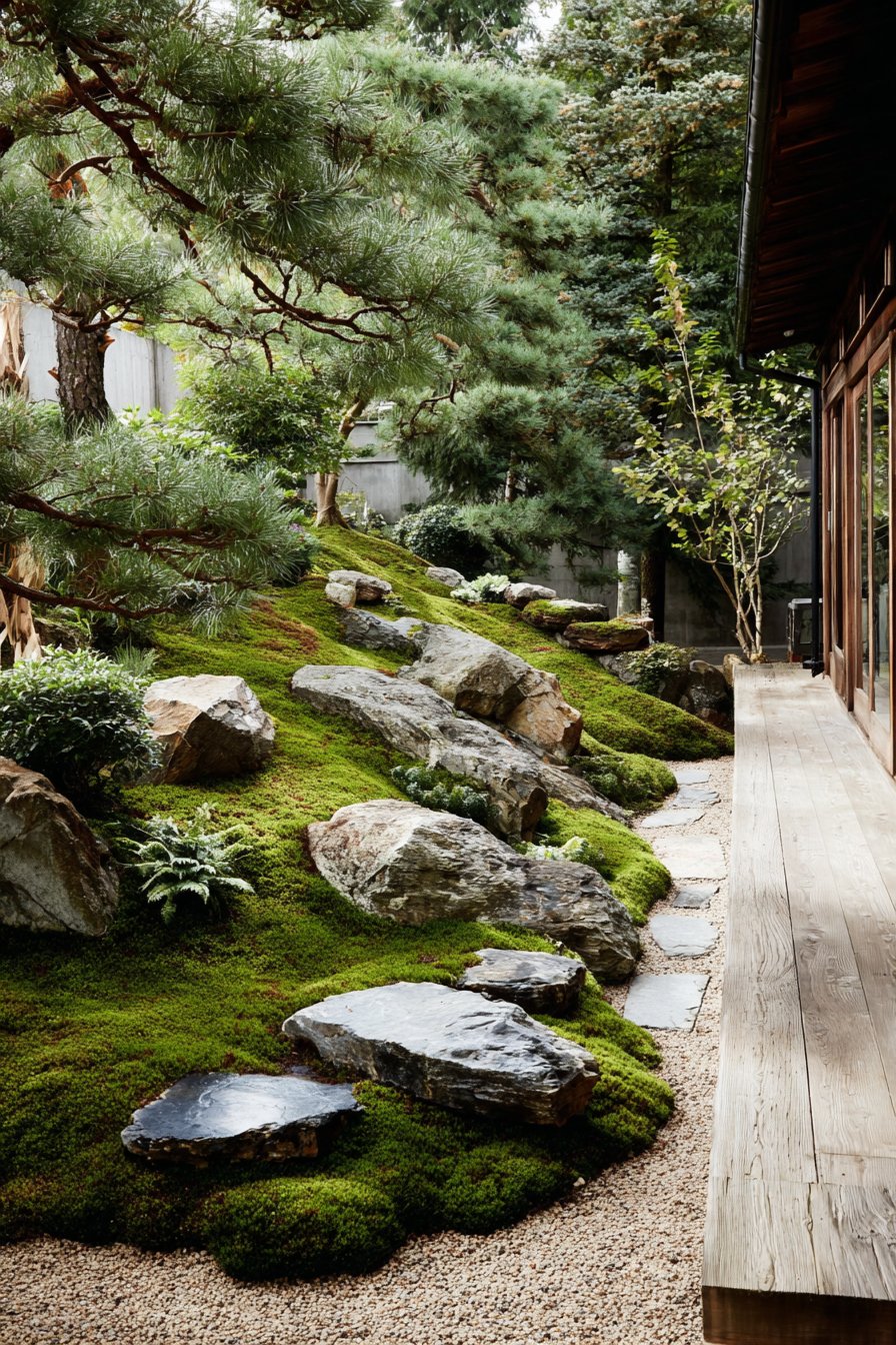 To recreate this look, consider using moss, Japanese black pine, and ornamental grasses like Miscanthus sinensis.