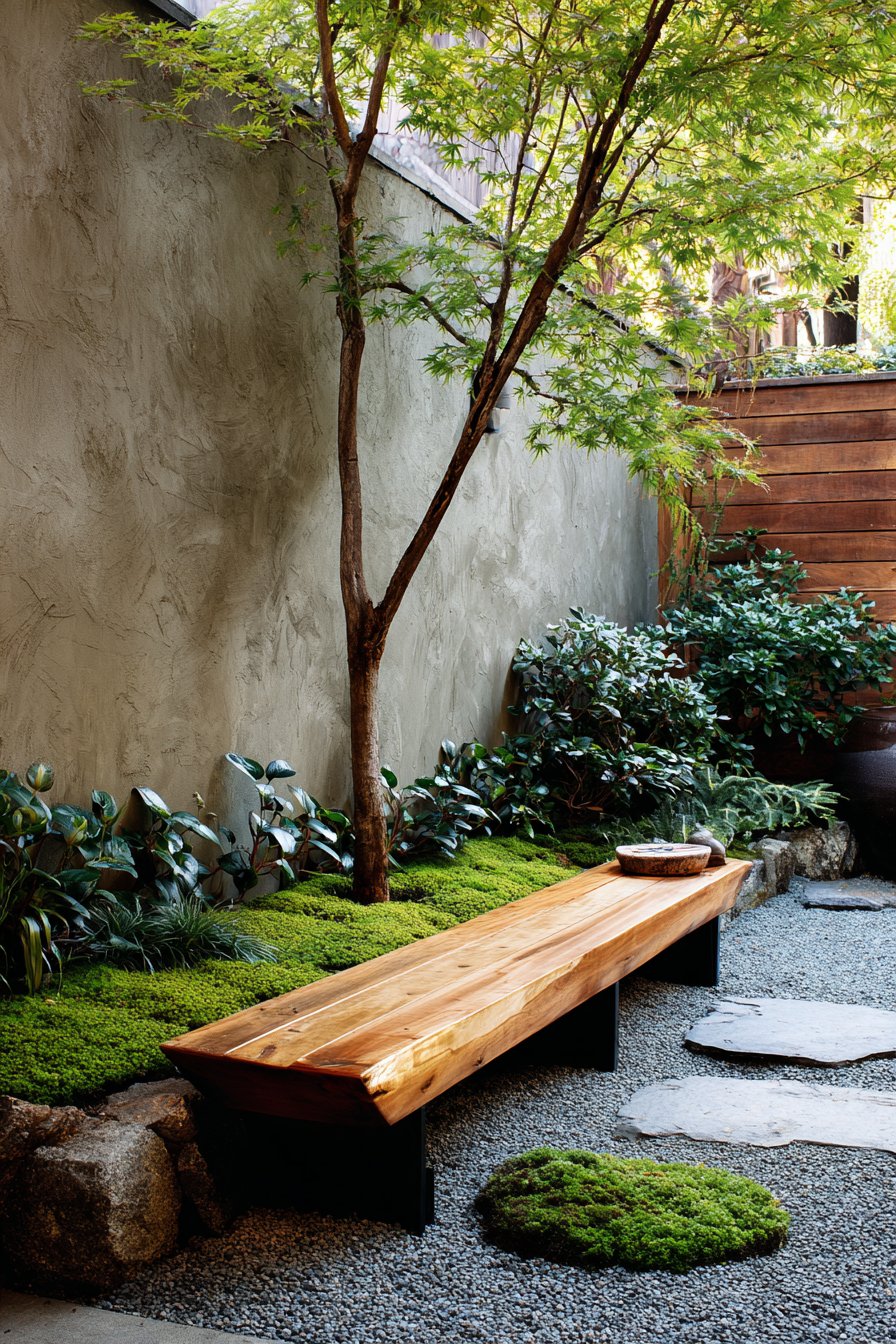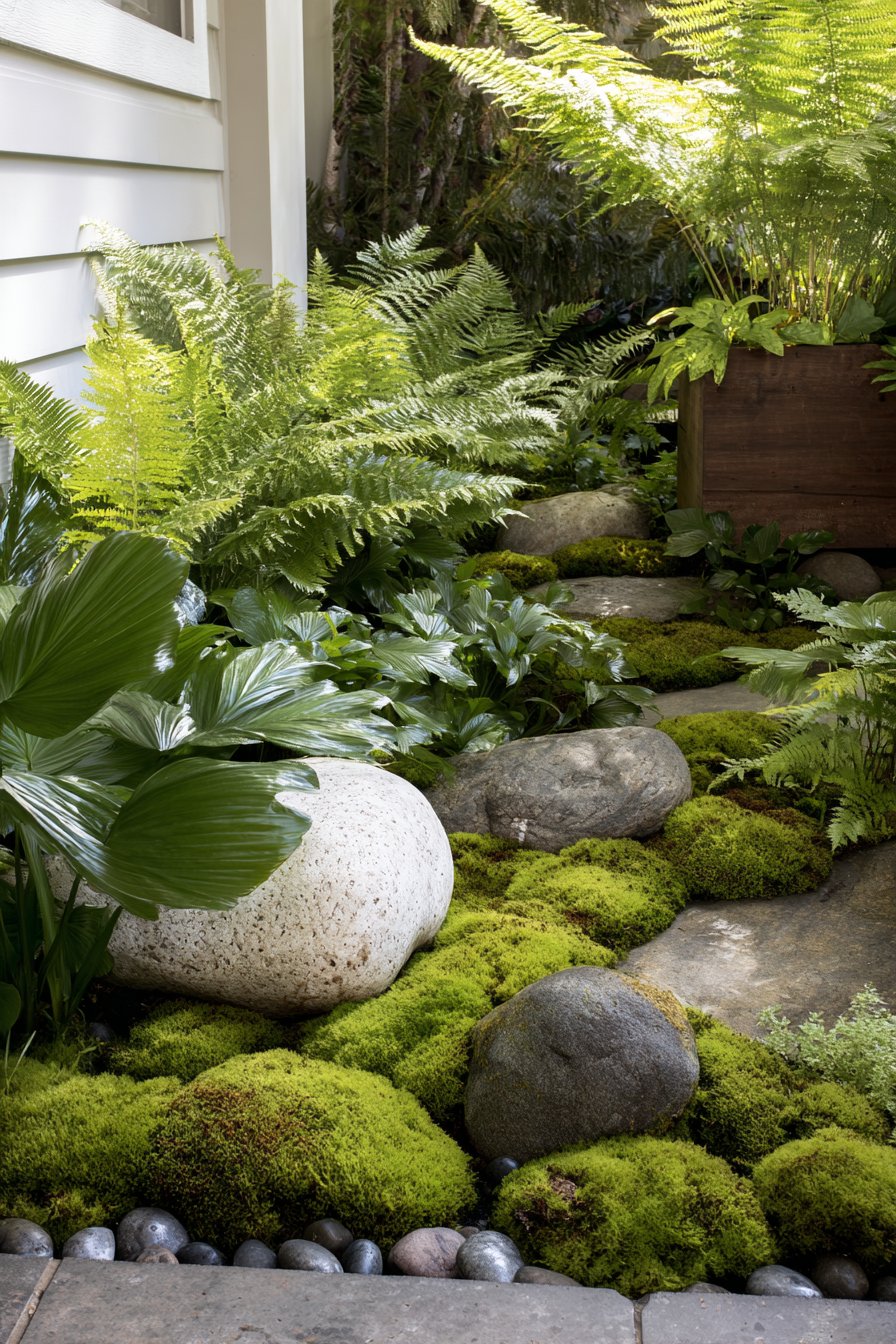 To recreate this look, consider using a Japanese maple for height, snake plants for vertical interest, and patches of moss for soft ground cover.