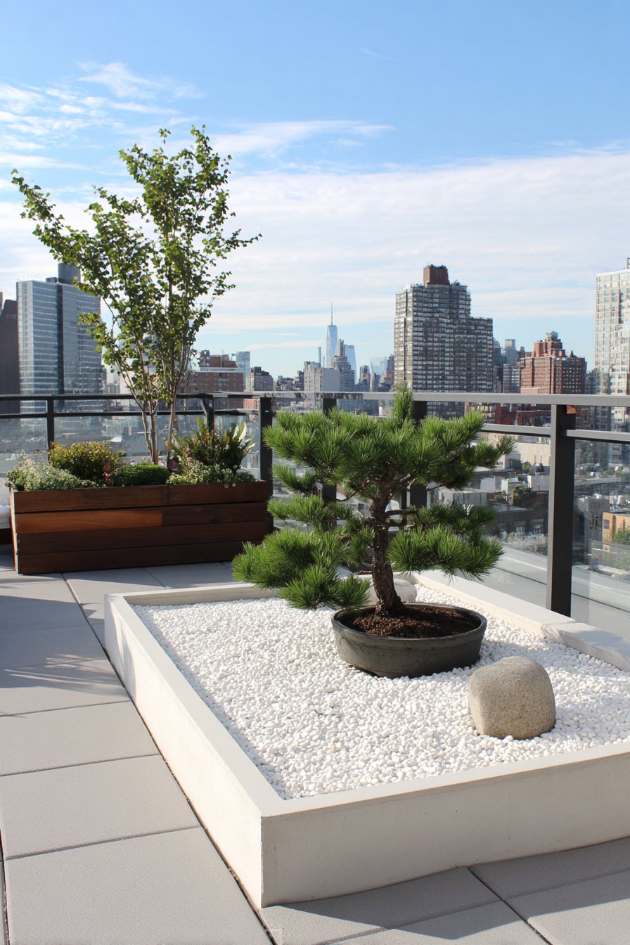 To recreate this look, consider using a Japanese Black Pine for structure and a variety of low-maintenance ground covers like Creeping Thyme or Sedum for added texture.