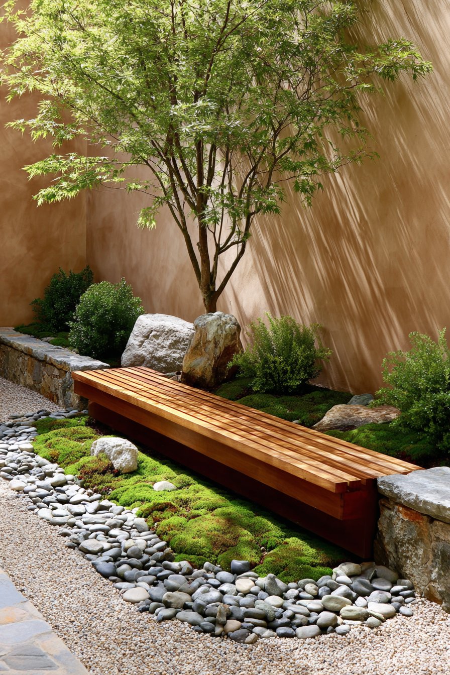 To recreate this design, consider using Irish Moss (Sagina subulata) for vibrant green accents and river stones for an organic, polished finish. Add a simple wooden bench for seating and a few ceramic pots for subtle decoration.
