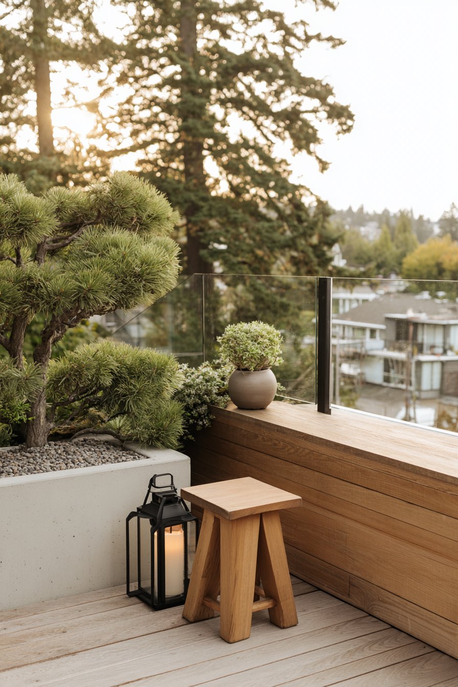 The serene blend of natural textures, from smooth stones to lush greenery, creates a calming retreat that invites relaxation on any balcony. Incorporating a bamboo screen for privacy and choosing a palette of whites and earthy tones will enhance the tranquil vibe.