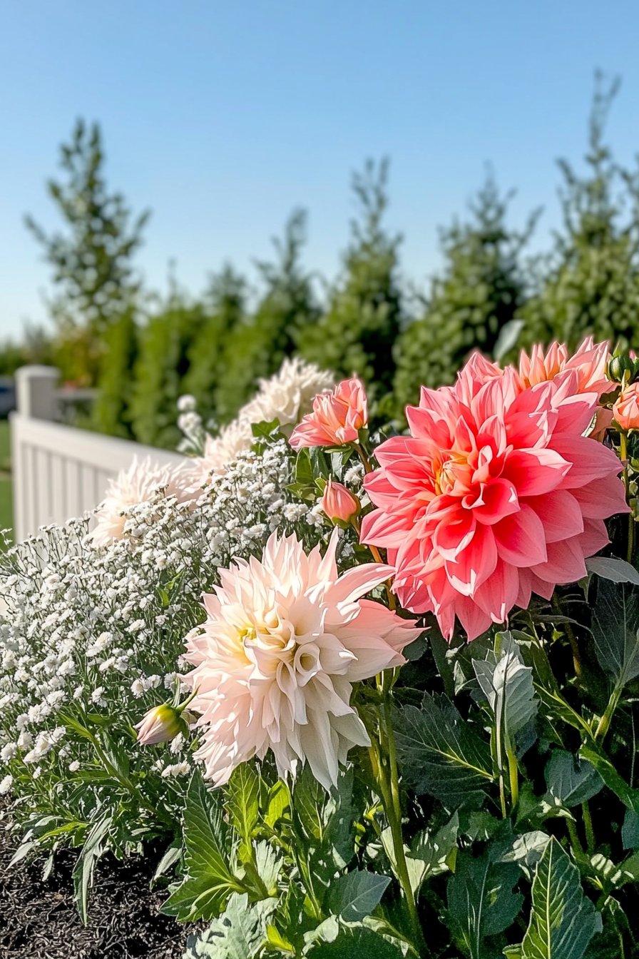 The vibrant dahlia blooms in shades of pink and white, complemented by delicate baby’s breath, create a stunning visual contrast that brightens any garden. For a similar effect, plant dahlias in well-drained soil and intersperse them with baby’s breath for an ethereal touch.