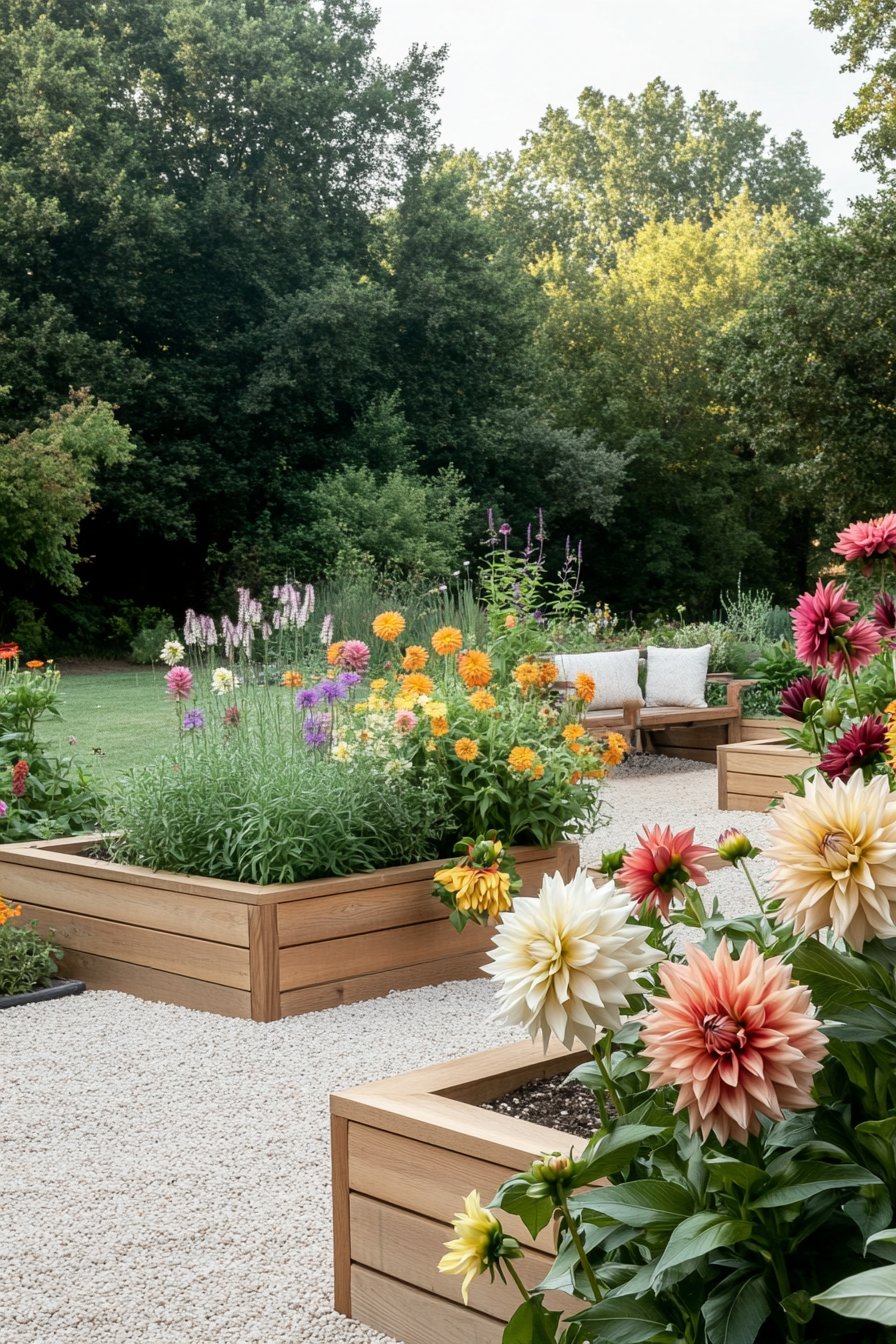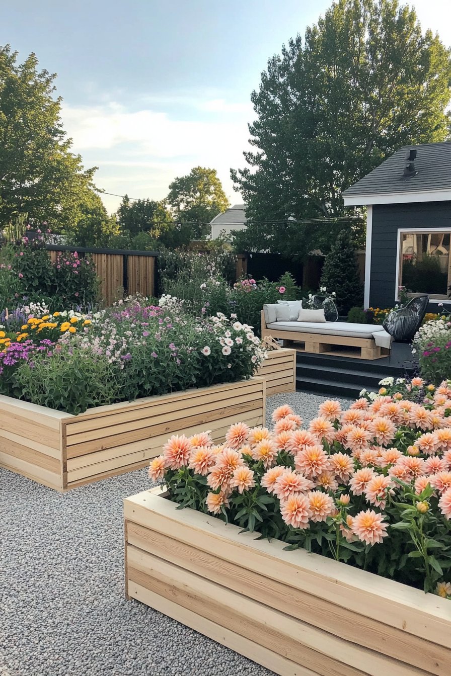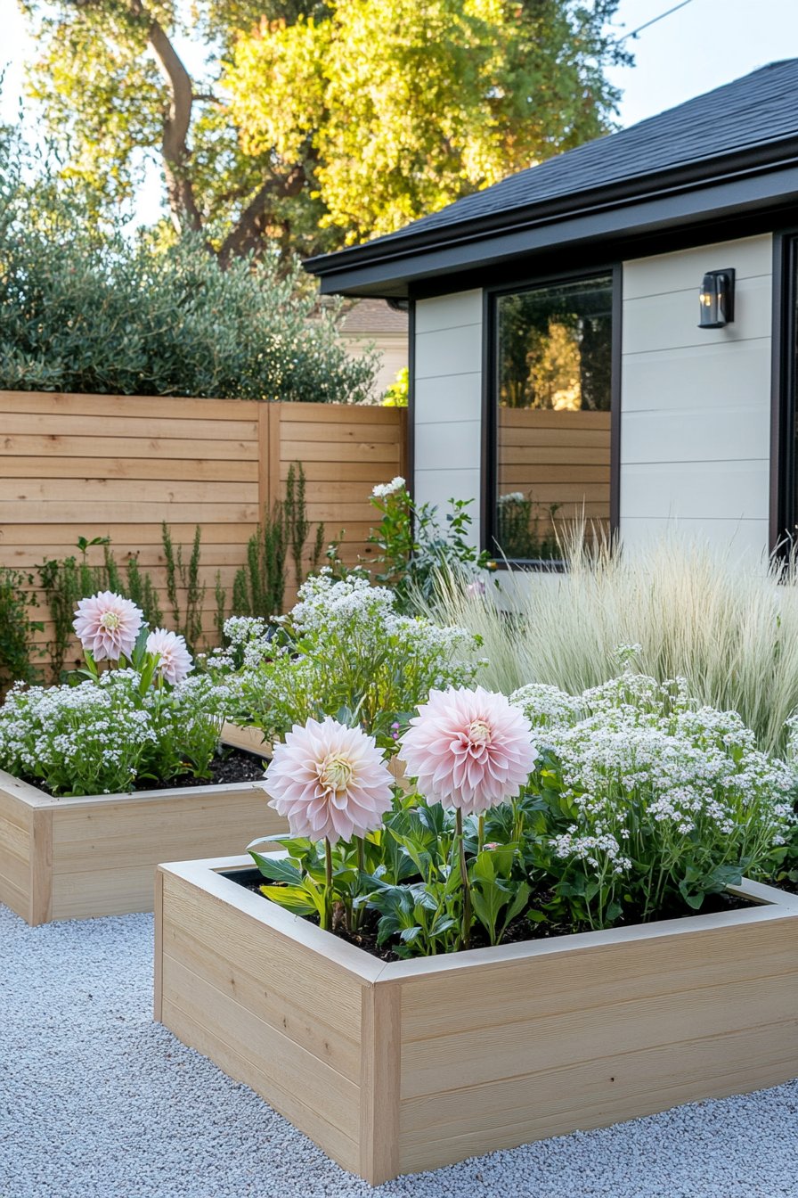 The elegant raised beds feature stunning pink dahlias surrounded by delicate , creating a charming contrast that enhances any garden space. To replicate this look, choose a mix of vibrant dahlias and low-growing ground covers, and consider using natural wood for a modern yet organic feel.