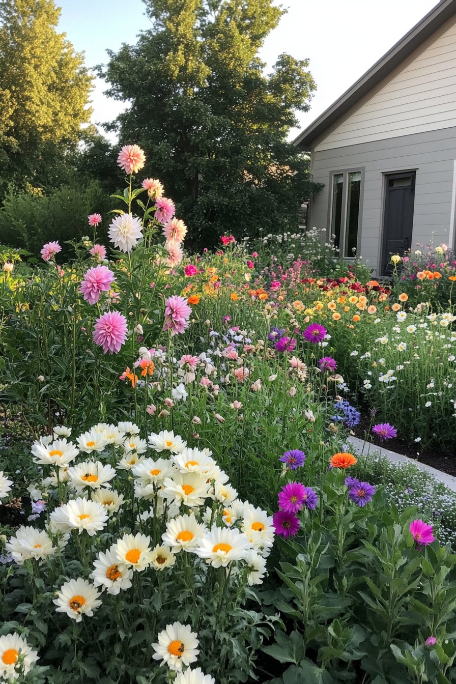 This garden bursts with vibrant dahlias and cheerful daisies, creating a lively tapestry of pinks, yellows, and purples that attracts pollinators. To replicate this stunning look, plant a mix of annuals and perennials for continuous blooms and use mulch to retain moisture and suppress weeds.