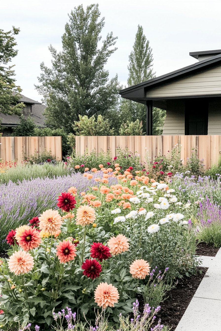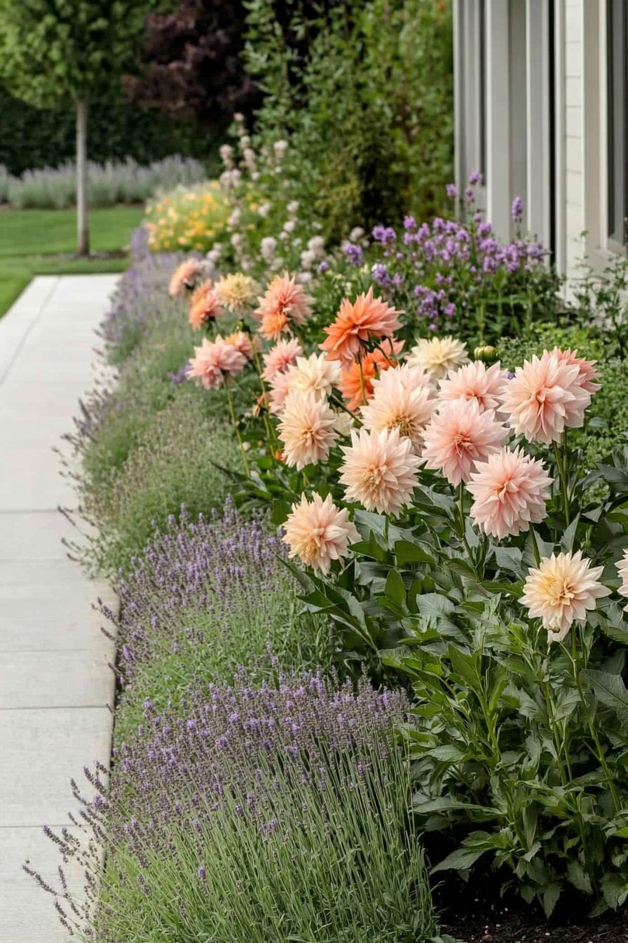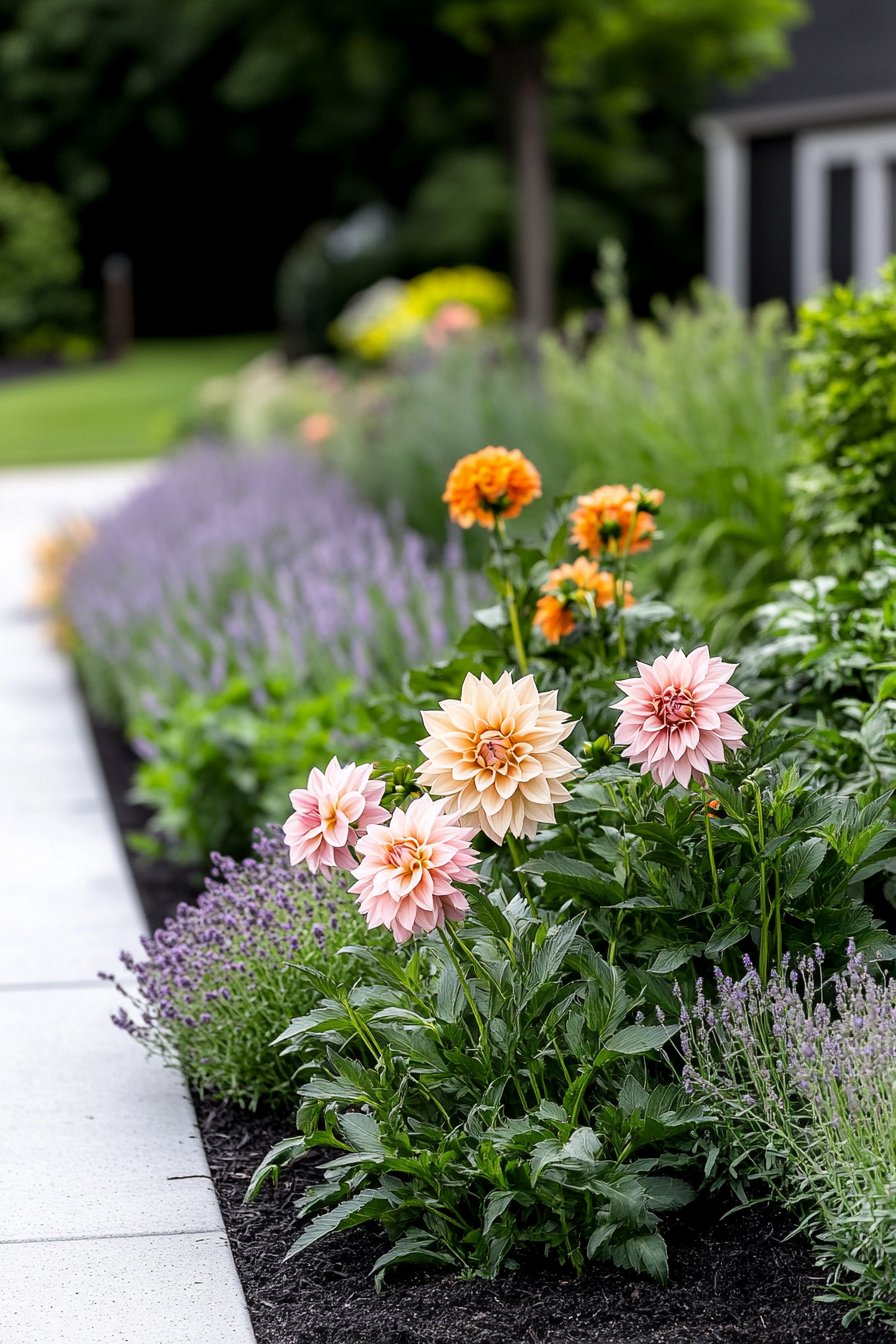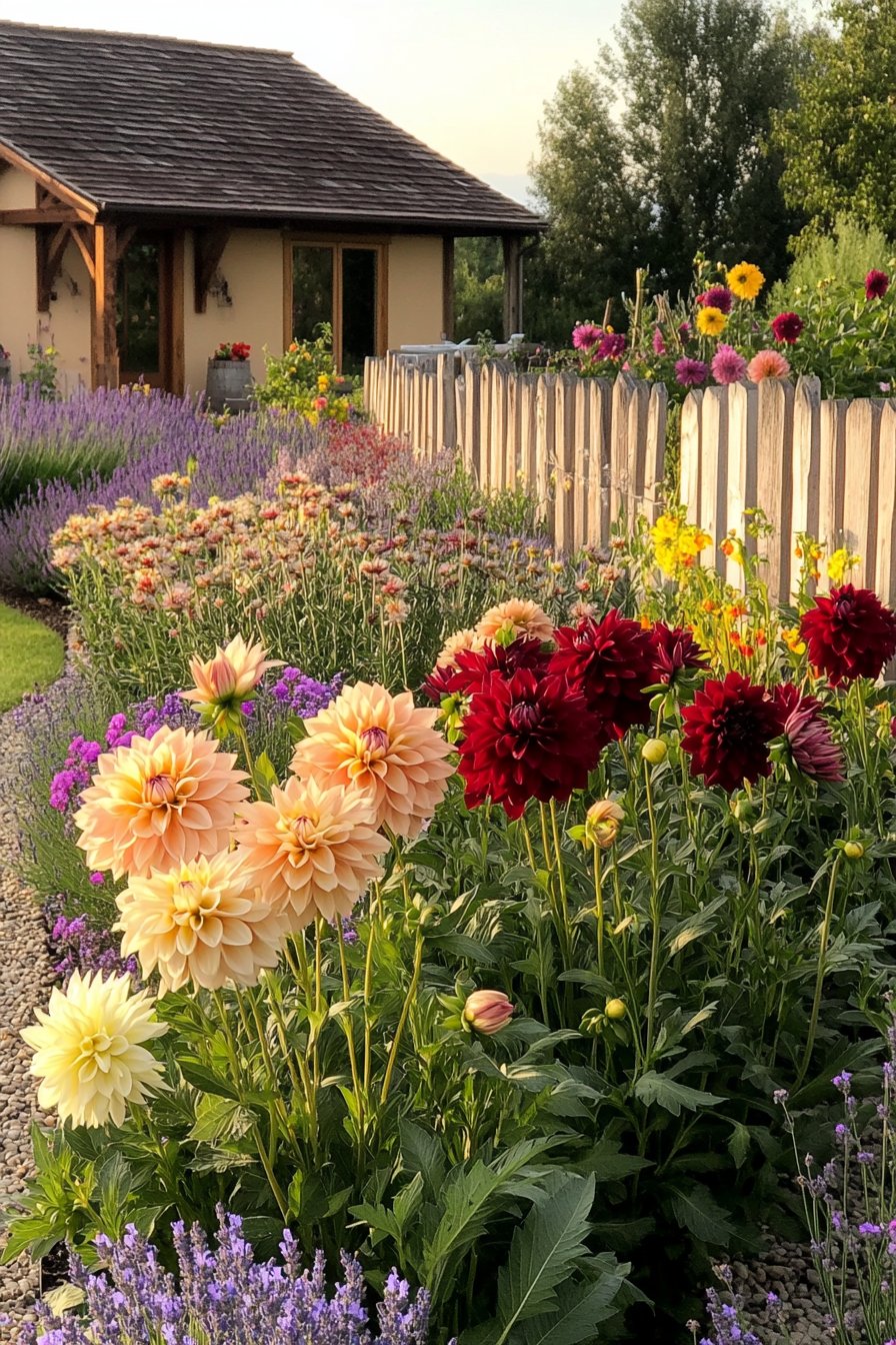 A stunning border of vibrant dahlias in shades of pink and orange contrasts beautifully with the calming lavender, creating a lively yet serene atmosphere. To achieve a similar look, plant dahlias for bold color and lavender for fragrance, ensuring a mix of heights for visual interest.