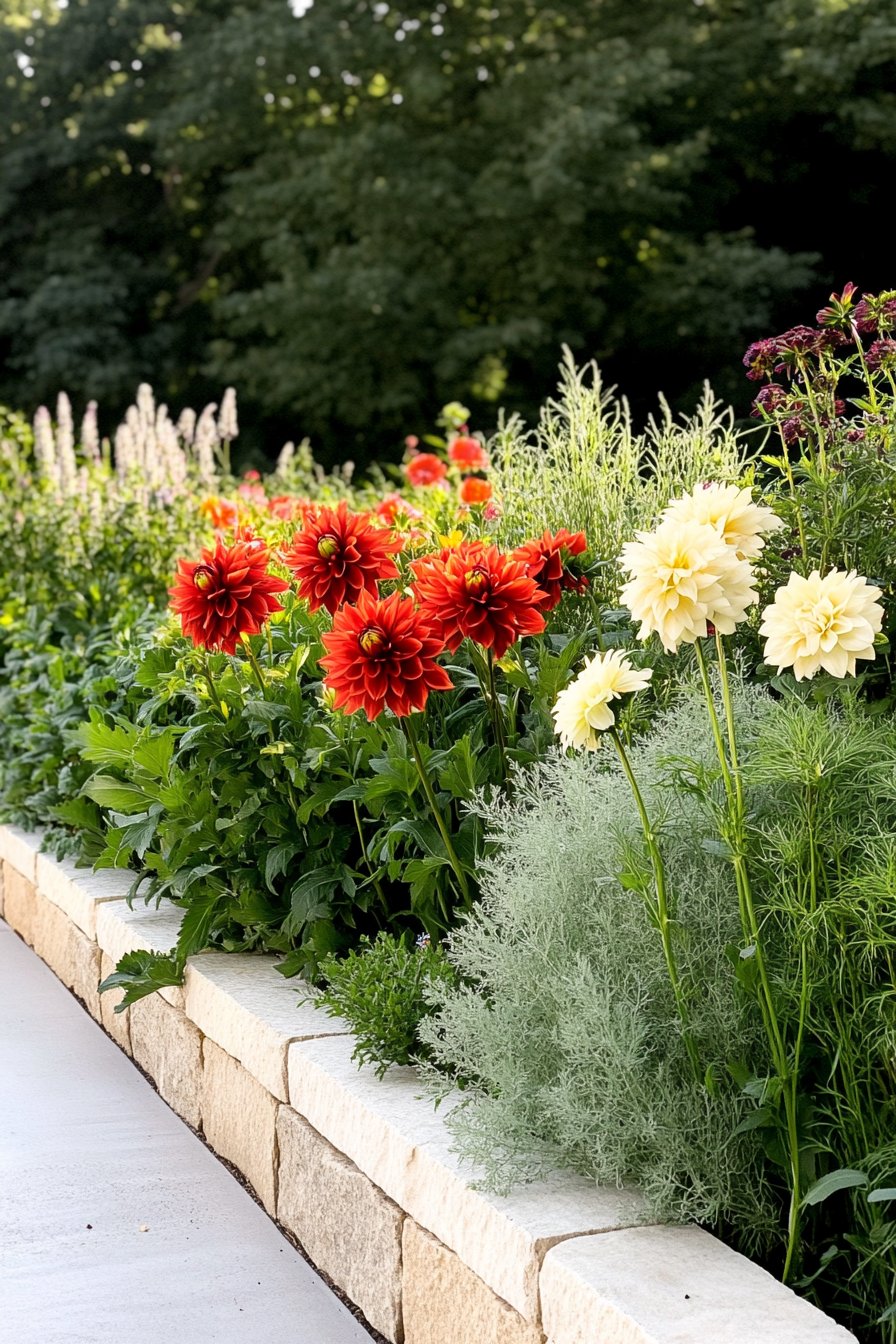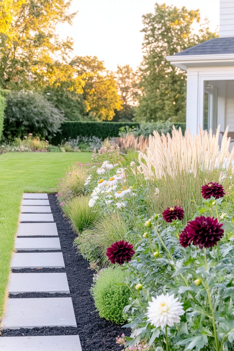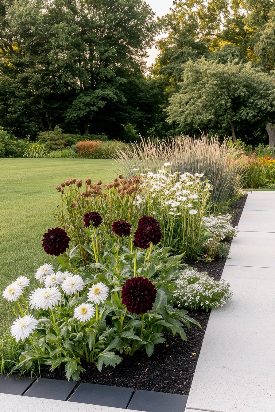 A stunning border of deep burgundy dahlias and bright white daisies creates a striking contrast, perfect for adding vibrant color to any garden space. Incorporate ornamental grasses to soften the edges and provide year-round interest, ensuring a balanced and modern aesthetic.