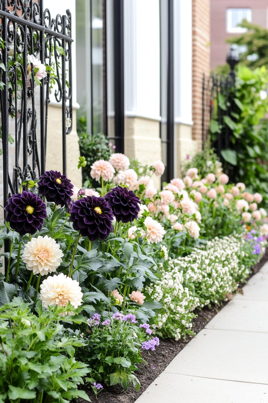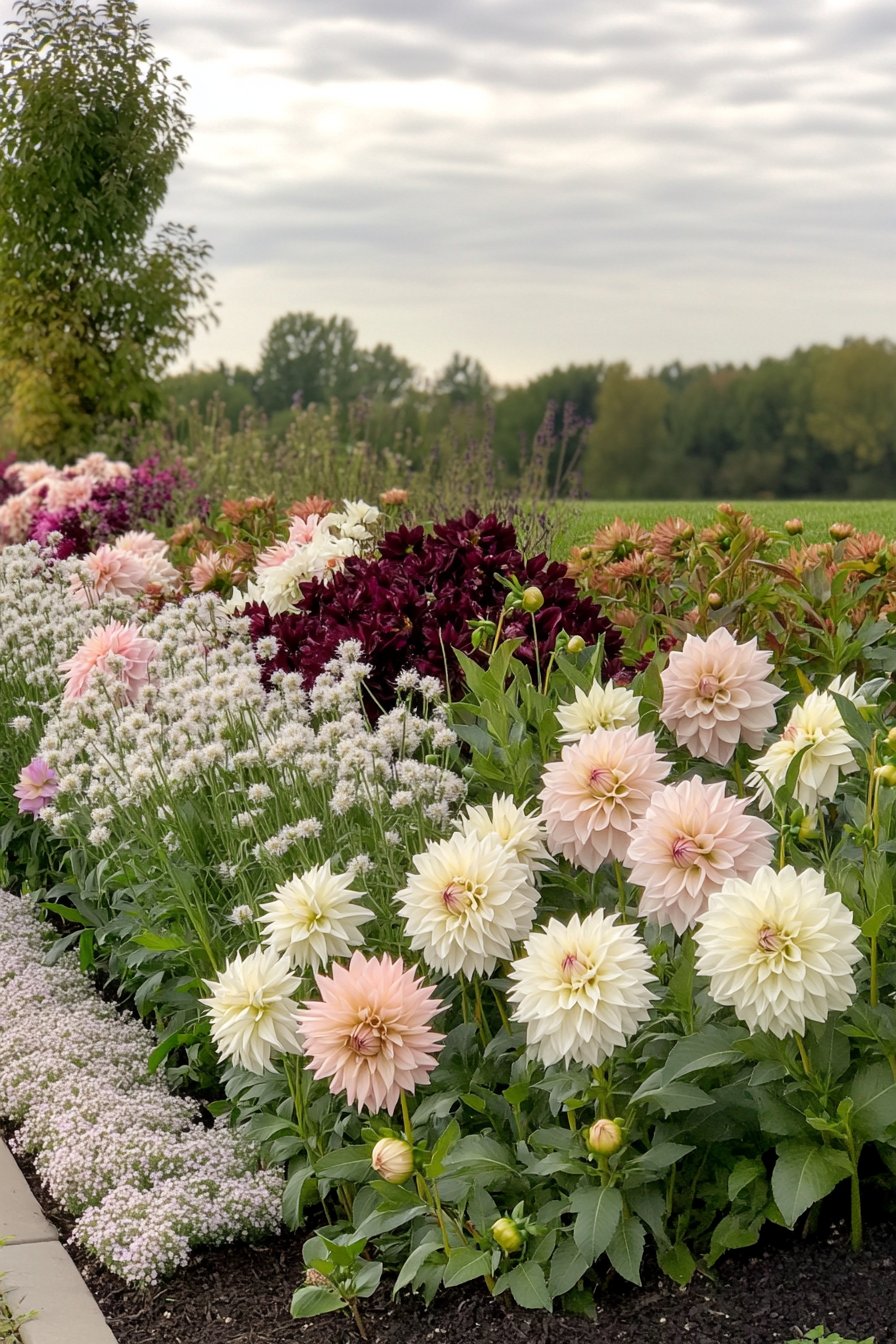 This garden features a stunning array of dahlia blooms in soft pastels and rich burgundies, creating a harmonious and elegant border. To achieve a similar effect, plant dahlias in well-drained soil and pair them with low-growing ground covers like alyssum for added texture.