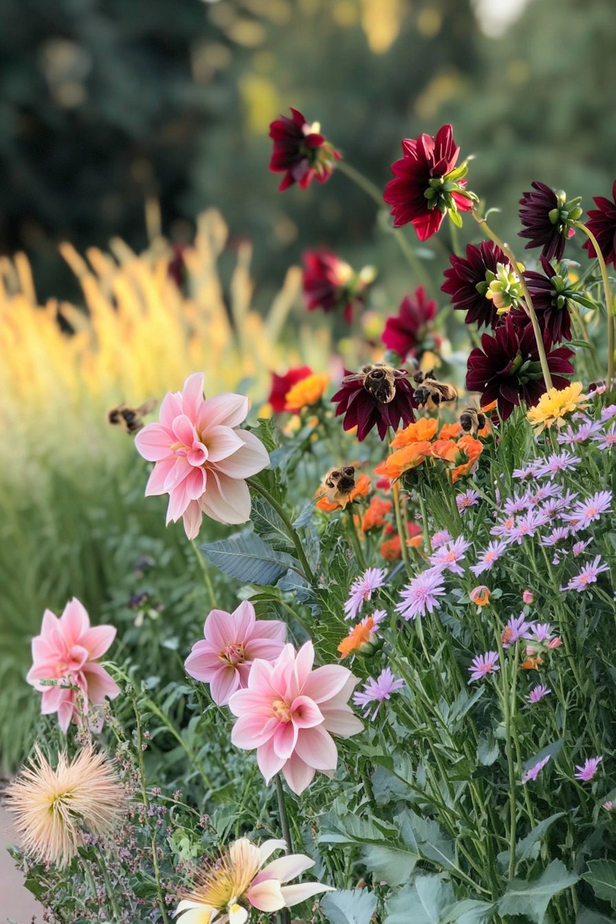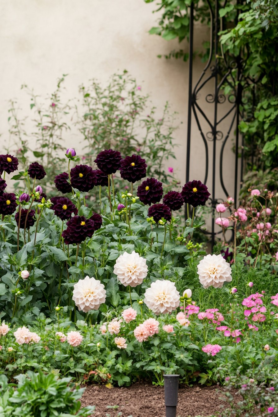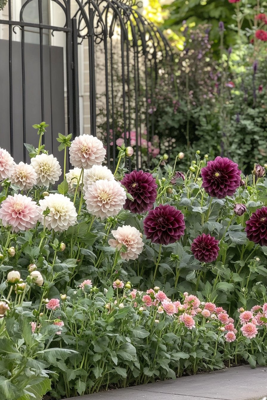 The striking contrast of deep burgundy and soft pastel dahlias creates a captivating focal point, inviting warmth and elegance to any garden. To replicate this look, combine various dahlia varieties with lush green foliage and sprinkle in some delicate pink blooms for added charm.