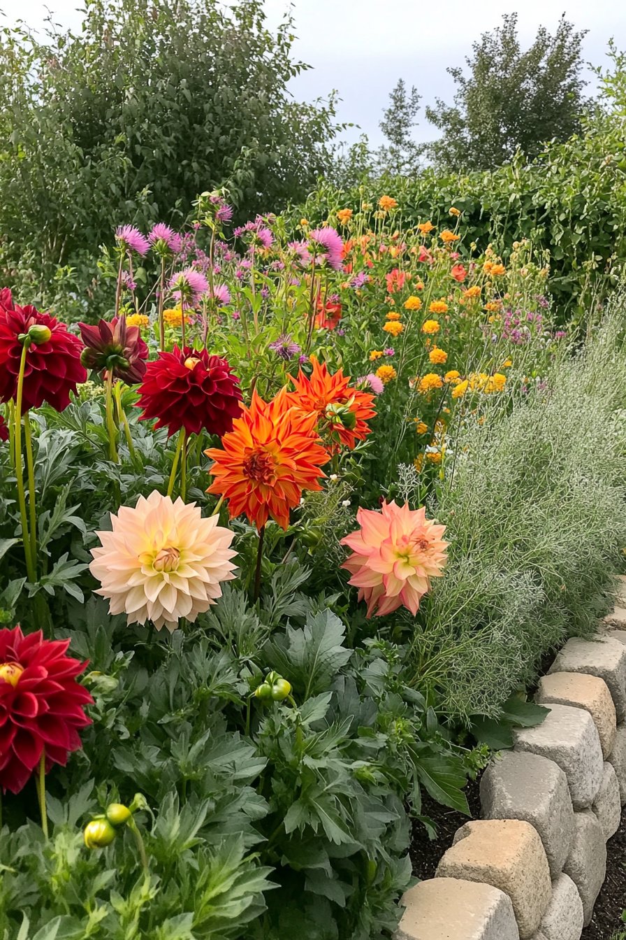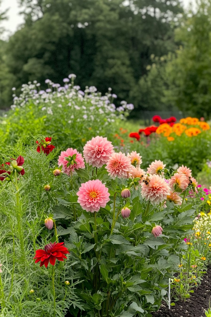 This garden bursts with vibrant dahlias in soft pinks and deep reds, harmonizing beautifully with cheerful wildflowers like marigolds and asters. To replicate this lively look, consider mixing tall grasses for texture and ensuring diverse bloom times for continuous color throughout the seasons.