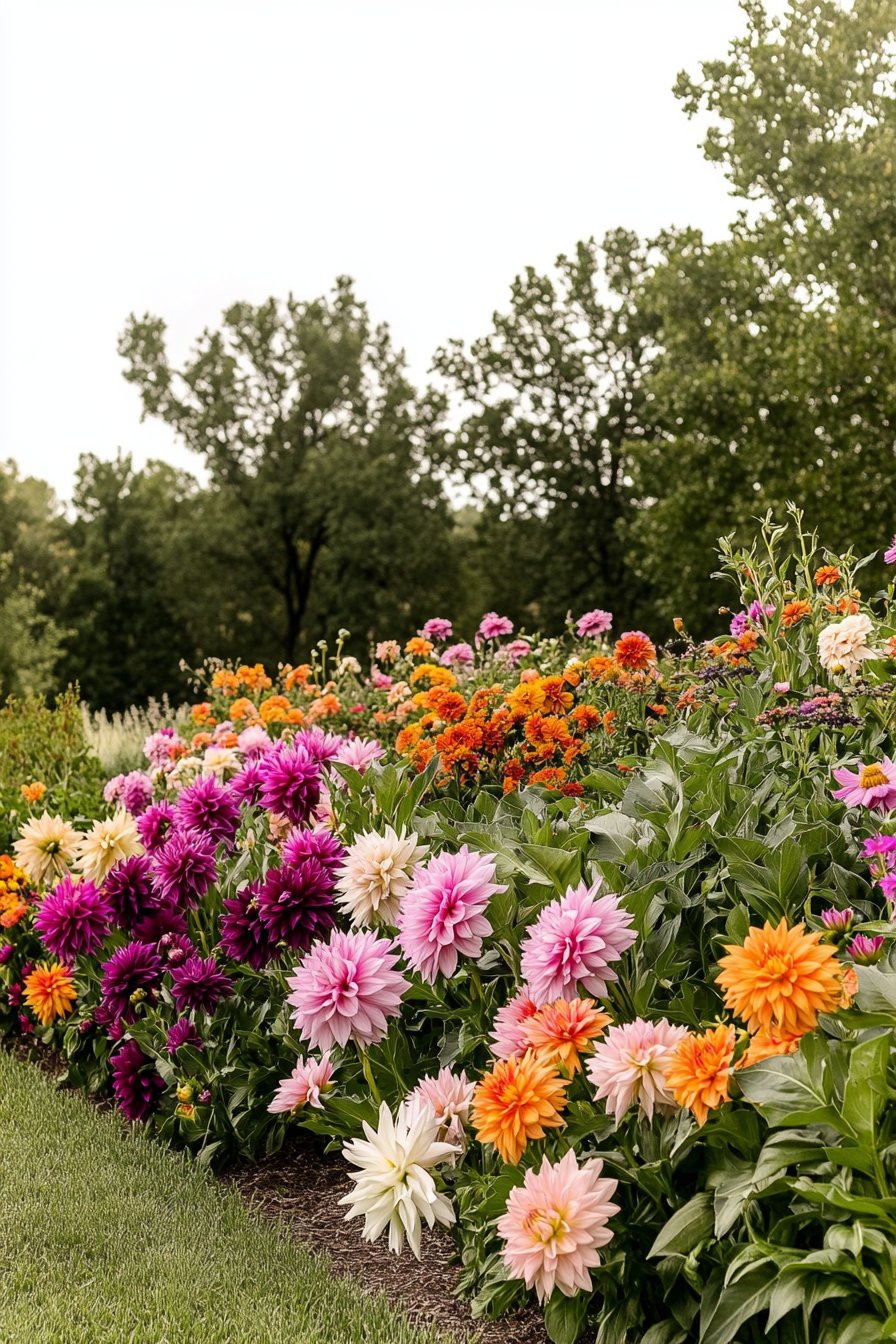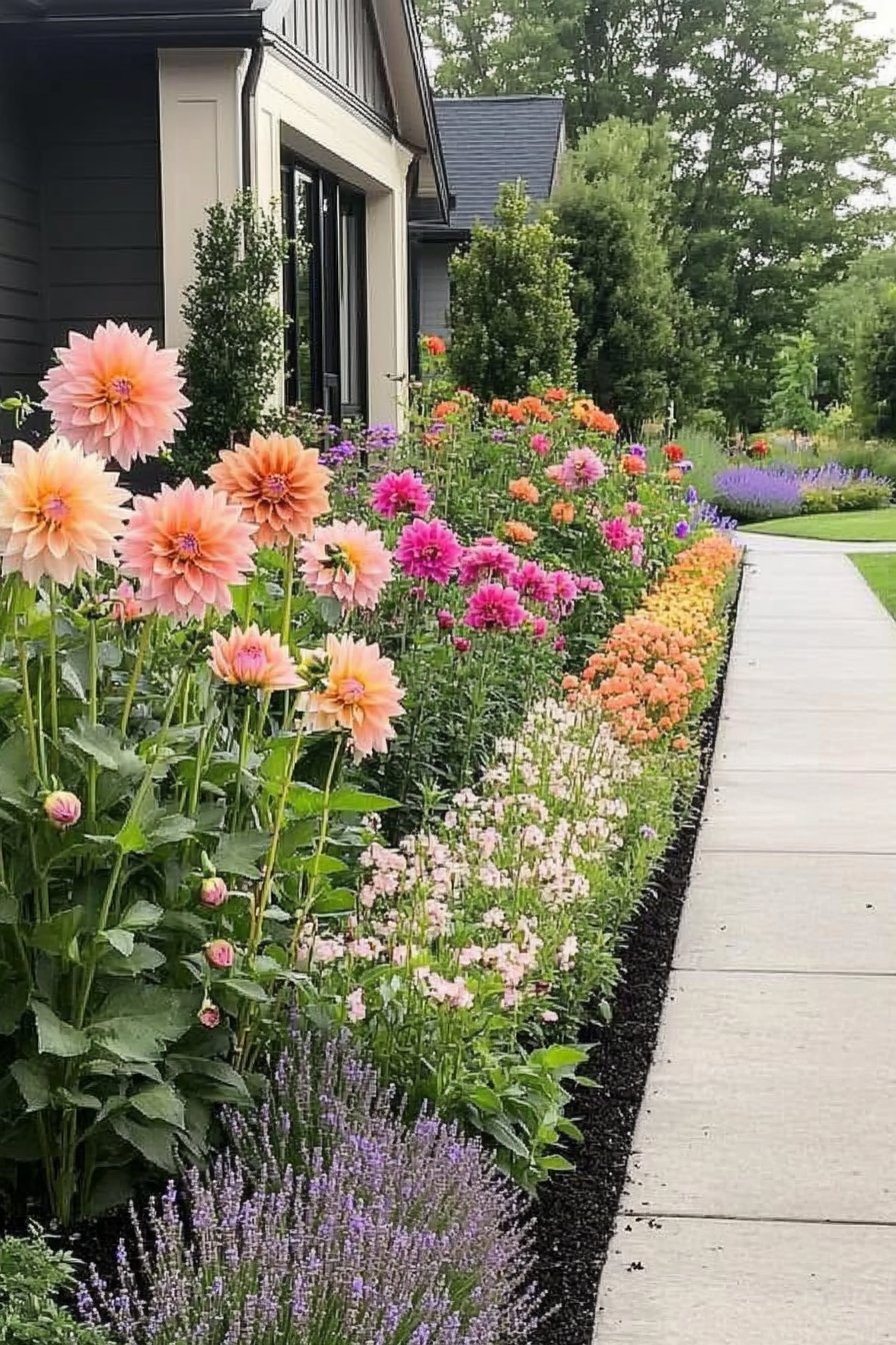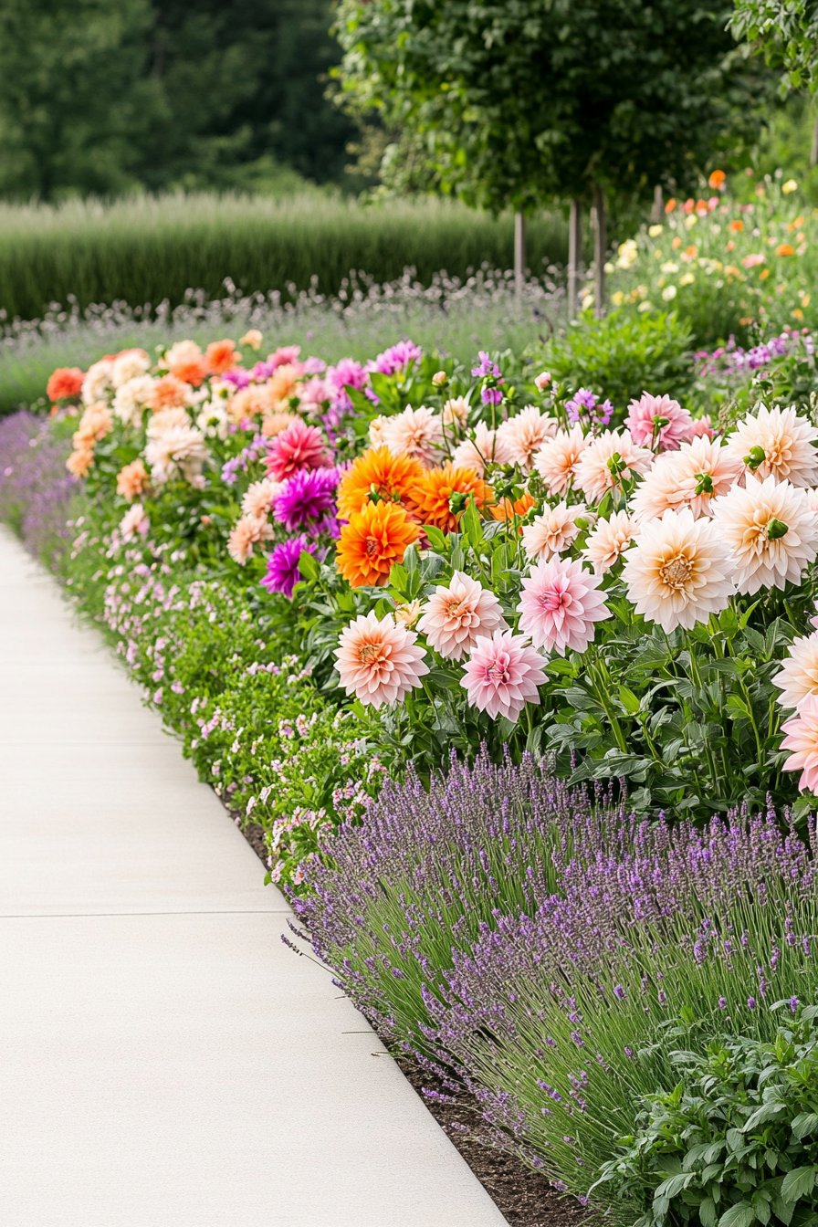 Vibrant dahlias in shades of pink, orange, and purple create a stunning border, complemented by delicate lavender for added texture and fragrance. To achieve a similar look, mix tall and short blooms while incorporating low-maintenance plants like lavender for a harmonious garden design.
