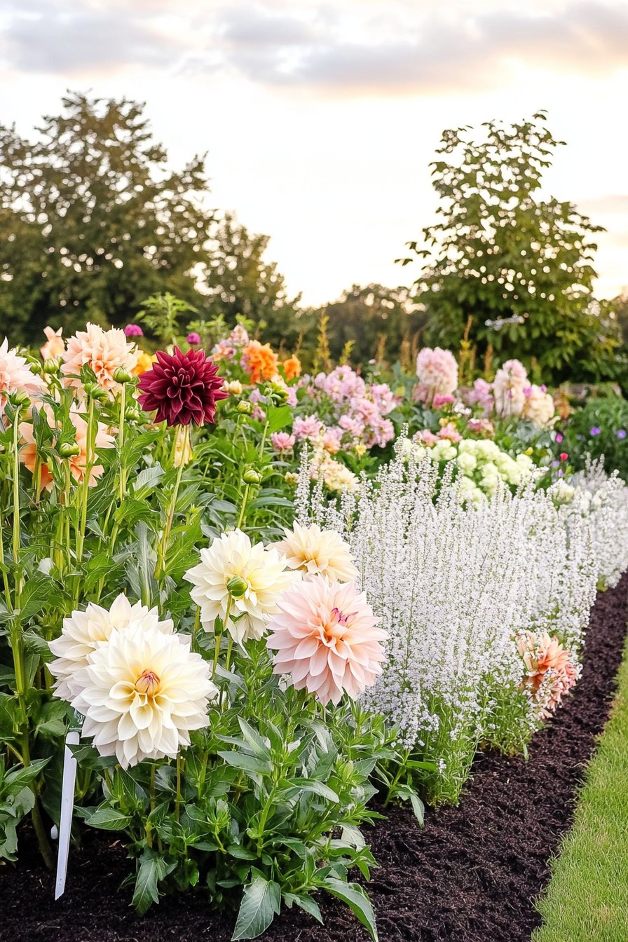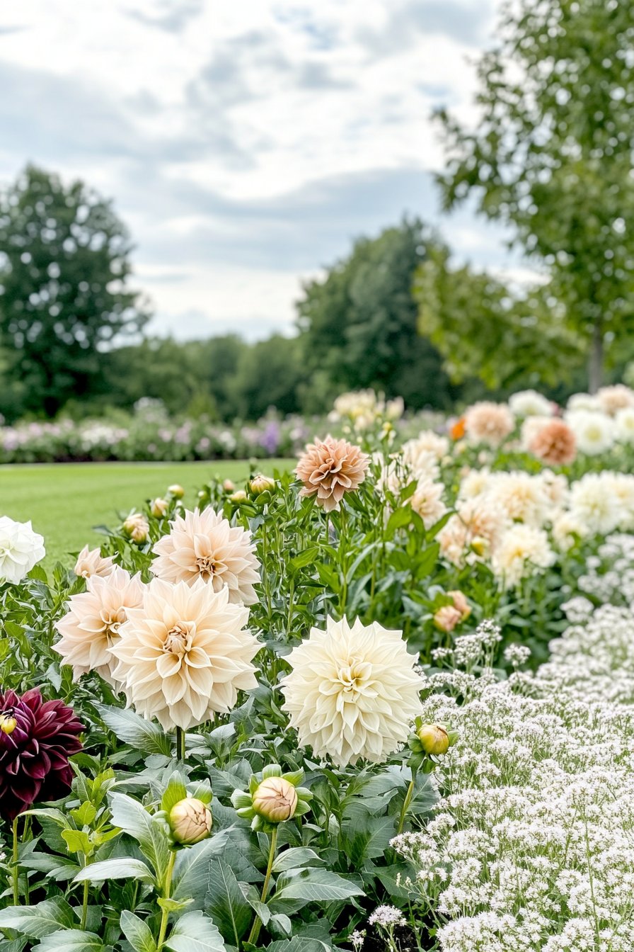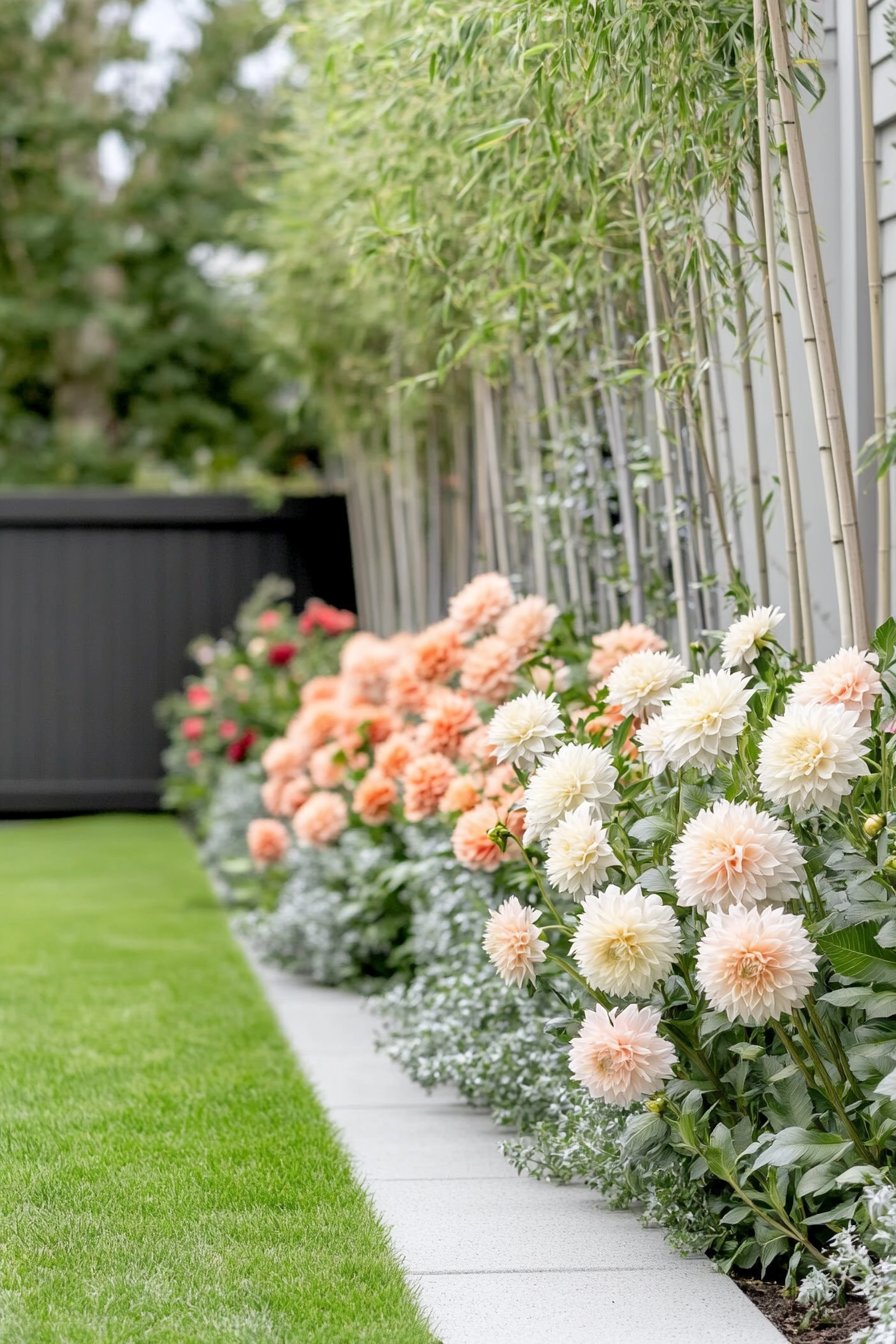 The harmonious blend of peach and white dahlias creates a stunning border, softened by lush greenery and delicate ground cover. For a similar effect, plant dahlias in clusters and use low-growing plants like silver dichondra to enhance the visual depth.